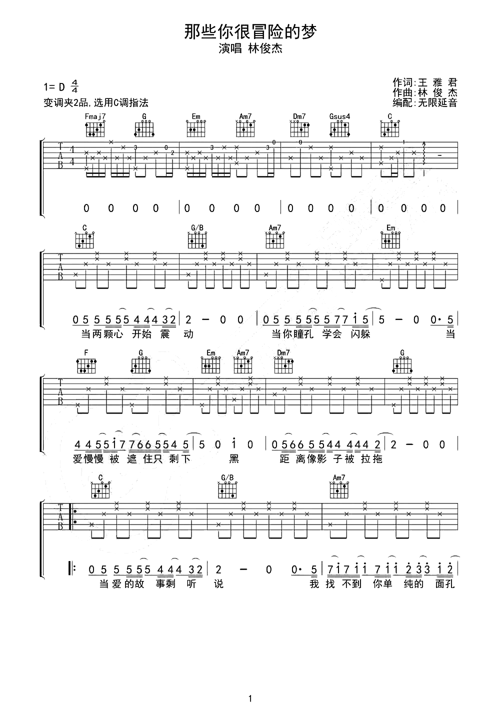 曲谱介绍: 林俊杰《那些你很冒险的梦》吉他谱,共三张高清六线谱,选用C调指法,变调夹可夹2品弹唱原调D调,节奏4/4拍,含简单原版前奏,难度初级简单。