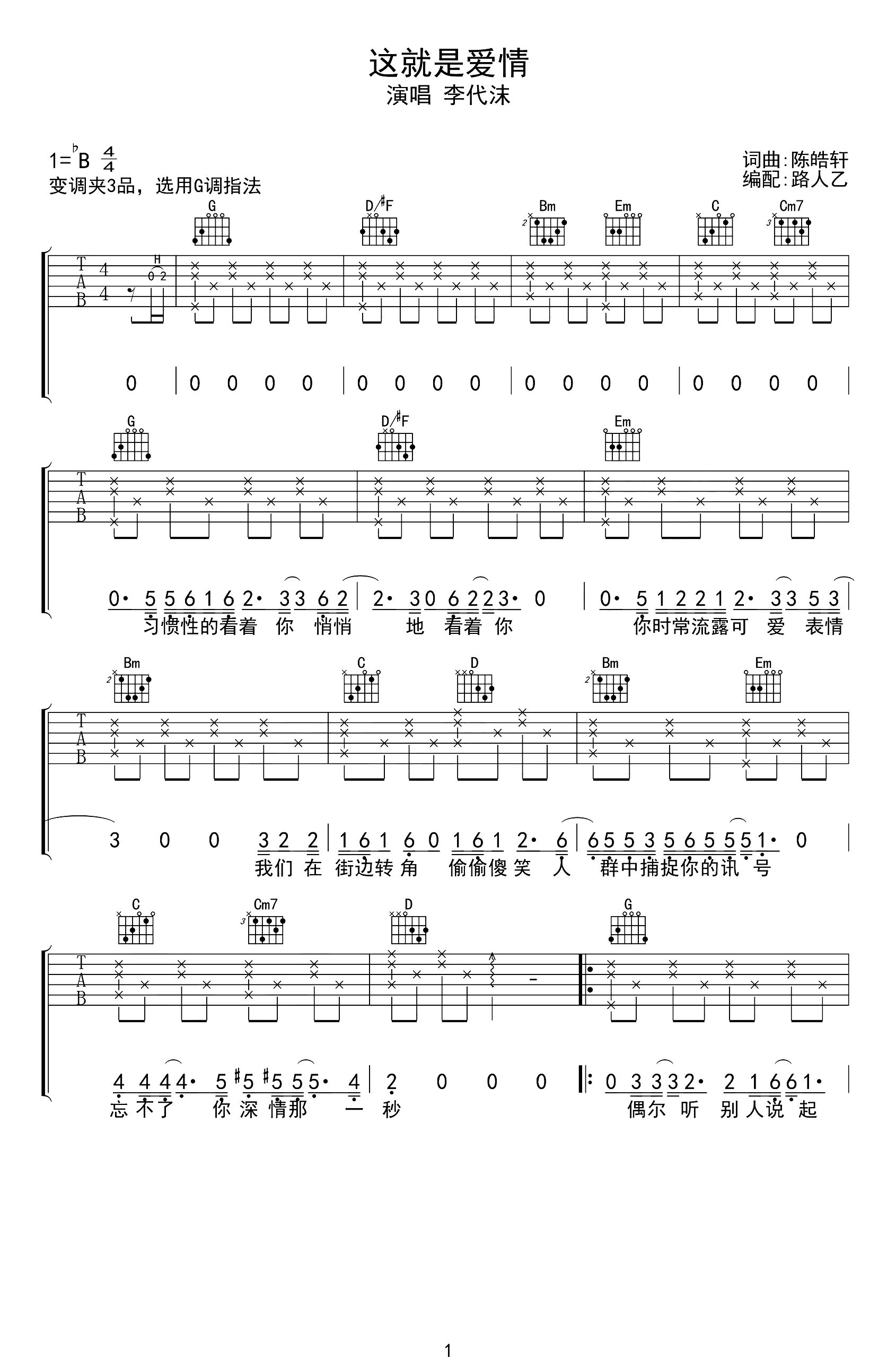 曲谱介绍: 李代沫一首细腻至极的情歌《这就是爱情》,用最温柔的嗓音诠释着大家不同的爱情,细细品味真实的情感表达,感受情感带给我们既美妙又虐心的感受吧。 李代沫《这就是爱情》吉他谱,共三张高清六线谱,选用G调,原调bB,变调夹可夹3品弹唱原调,本谱按简易原版编配,难度初级简单。