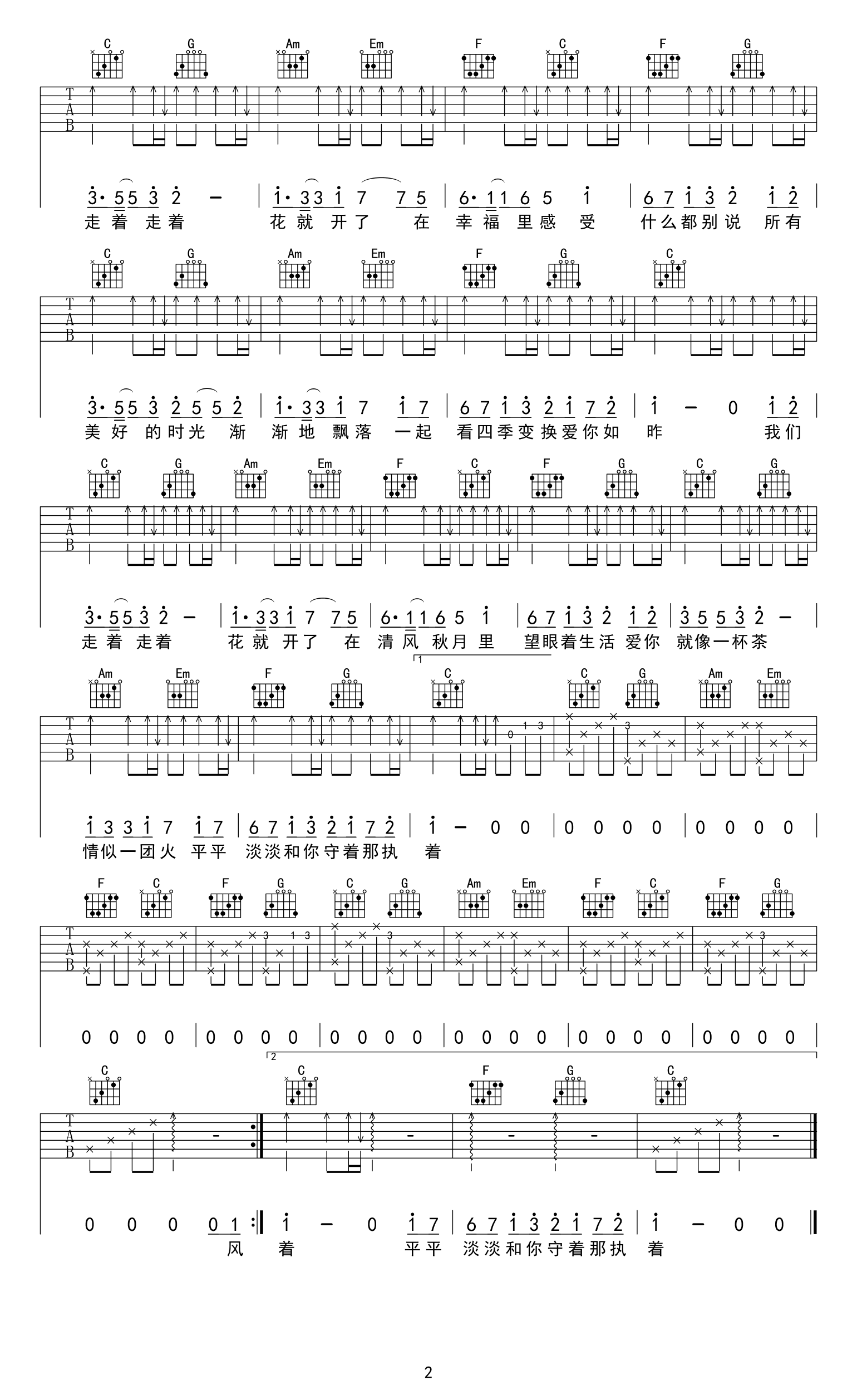 曲谱介绍: 《走着走着花就开了》吉他弹唱谱,共2张高清六线谱,选用C调,可根据自己的嗓音条件调整变调夹位置,本谱由亦生制谱。