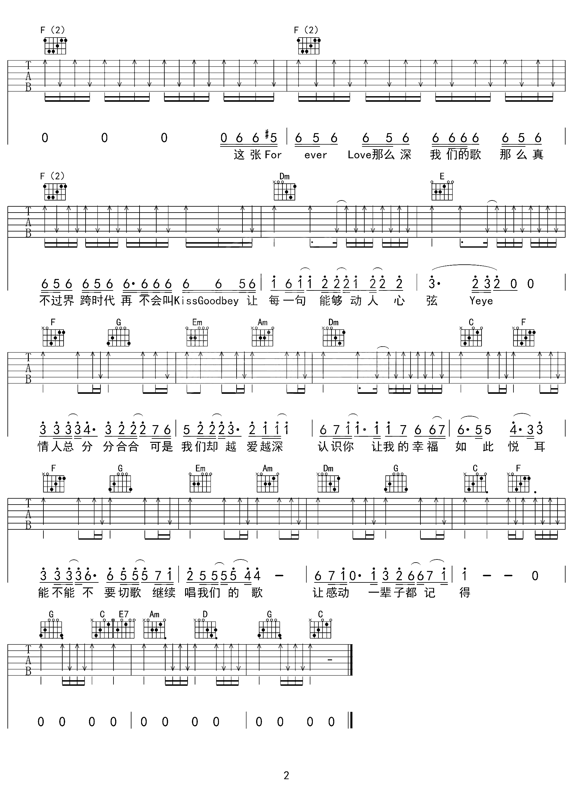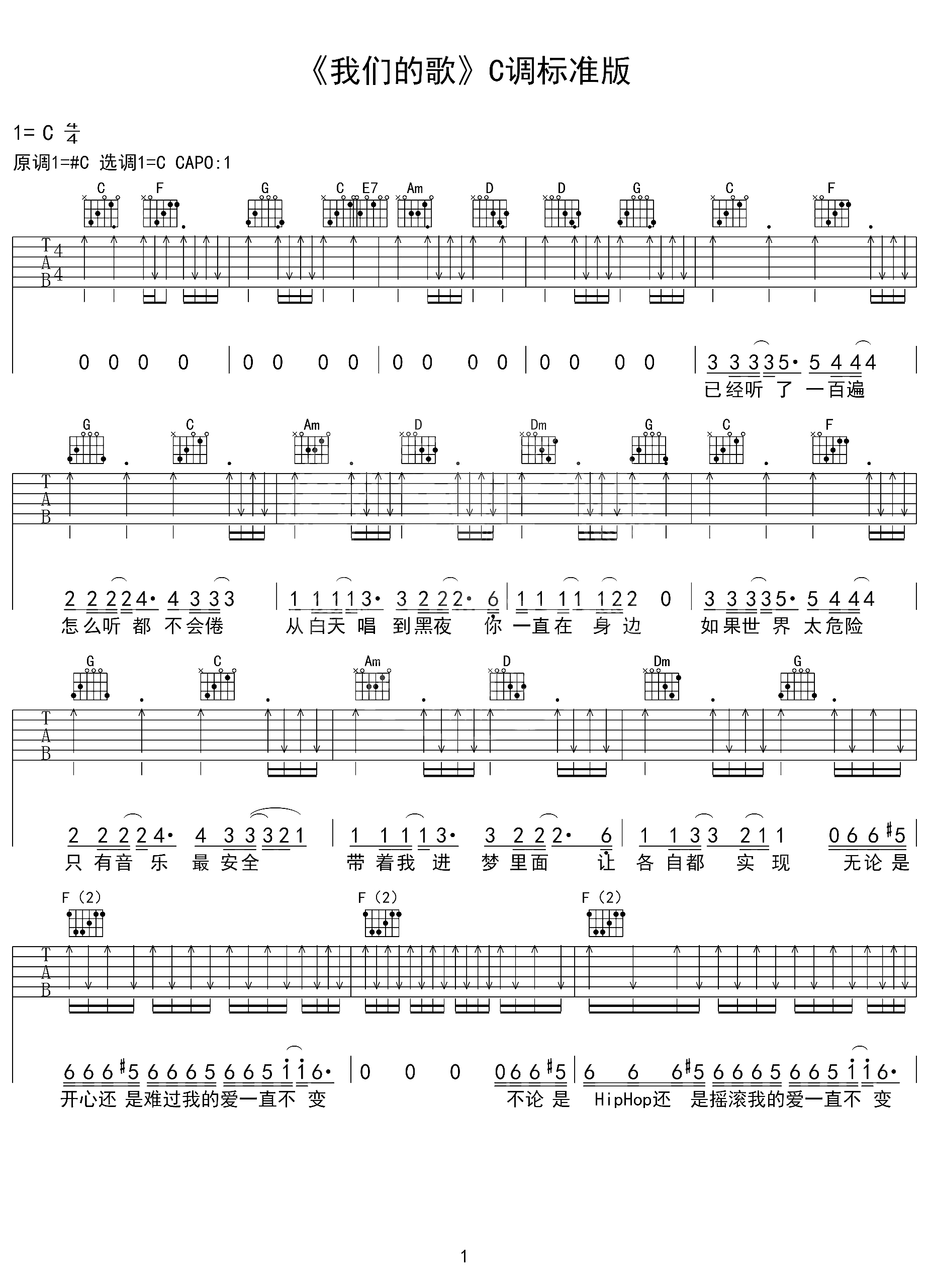 曲谱介绍: 我们的歌吉他谱,王力宏一首快乐的歌,我们的歌就如我们的感情一样,定为专属,在绚烂的旋律之下,营造的是浪漫甜蜜的调调,让彼此永远不变的心越陷越深。 《我们的歌》吉他六线谱,选用C调指法,原调#C,CAPO推荐在1品位,全扫弦版节奏编配,注意切音技巧的穿插,会让这首歌曲更有味道哦。