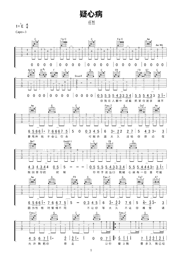 曲谱介绍: 仍然《疑心病》吉他谱,精选原版编配,选用C调指法,原调bE,CAPO夹3品弹唱原调,含完整前奏,难度适中,共3张图片谱例。