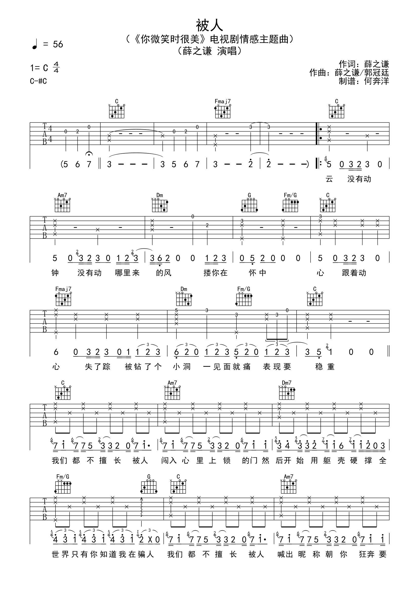 曲谱介绍: 薛之谦《被人》是《你微笑时很美》电视剧情感主题曲,缓慢的弦乐混音拉开了歌曲的序幕,给人一种海底空灵的感觉,老薛一贯有质感的磁性低音,直接将情绪细化,从歌词“哪里来的风,搂你在怀中”开始,就满满的勾起回忆。 被人吉他谱,由何奔洋制谱分享,选用C调指法,原调C转#C,速度56BPM,节奏4/4拍,共2张高清图片谱例,弹唱难度初级较简单。