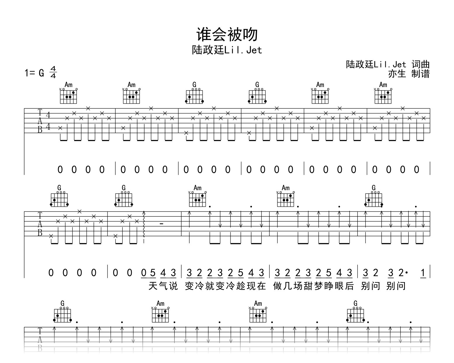 谁会被吻吉他谱 - 陆政廷 - G调吉他弹唱谱