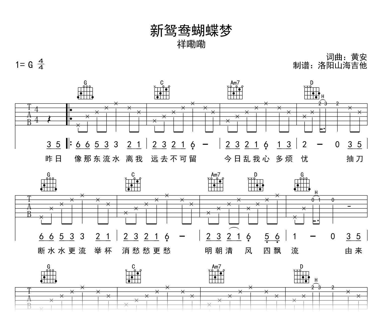 曲谱介绍: 新鸳鸯蝴蝶梦吉他谱,祥嘞嘞翻唱版本,黄安原唱的一首经典华语流行怀旧金曲。《新鸳鸯蝴蝶梦》吉他弹唱谱,选用原调G调指法编配,高清图片谱共两张图片。 回忆满满的歌曲,熟悉的旋律响起,当年追看热播电视剧《包青天》的情境又浮现脑海,这首歌已成为耳熟能详的跨世纪金曲。