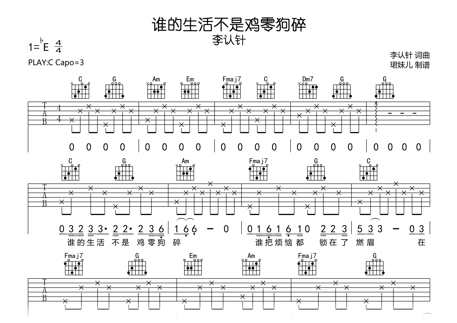 谁的生活不是鸡零狗碎吉他谱 - 李认针 - C调吉他弹唱谱