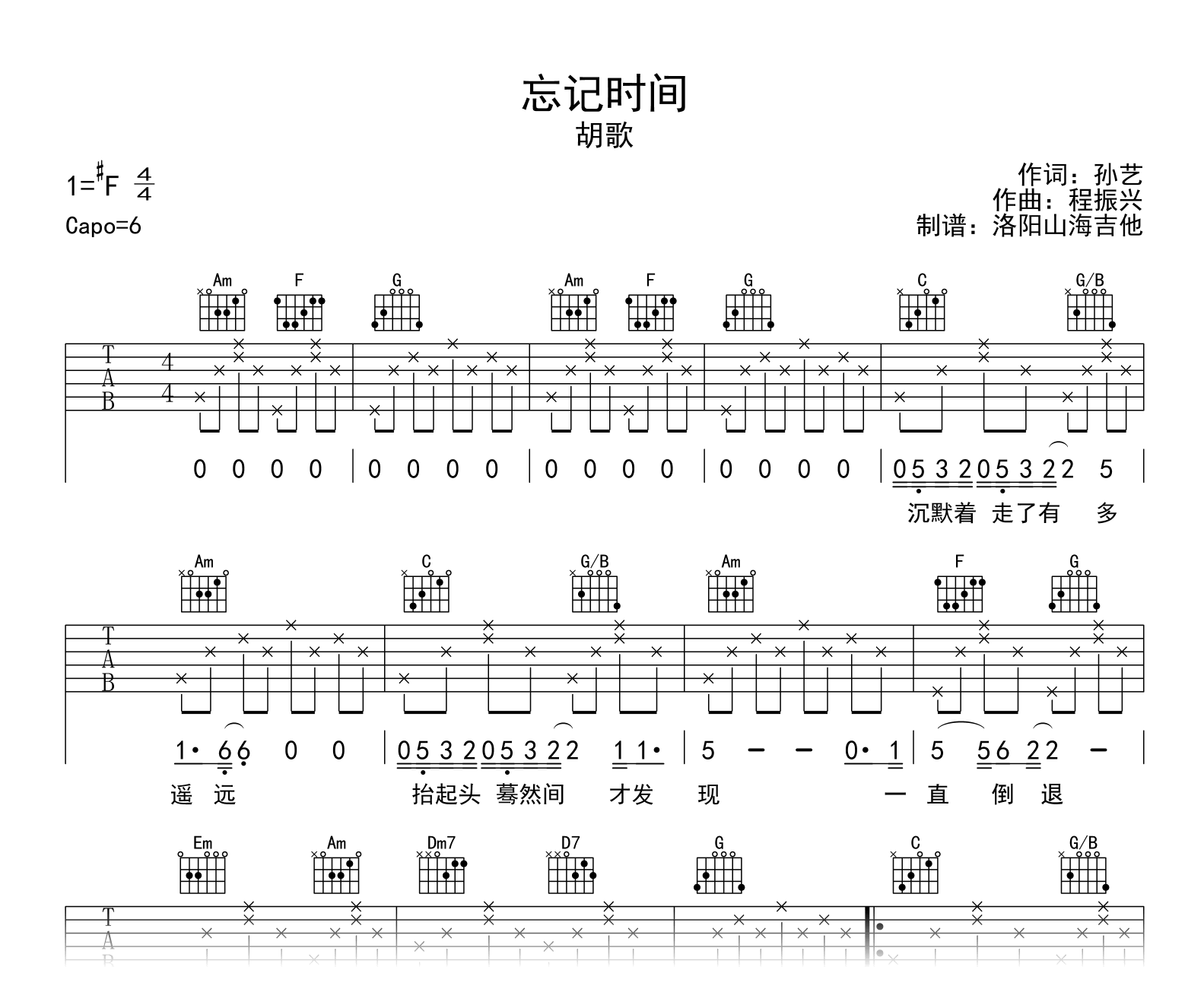 曲谱介绍: 忘记时间吉他谱,胡歌演唱的一首经典老歌,《仙剑3》片尾曲。《忘记时间》吉他弹唱谱,原调升F,选用C调指法编配,变调夹Capo六品,完整六线谱共两张高清图片。 一首画面感很强的抒情慢歌,时光流转中,有关电视剧的回忆片段依次呈现。仿佛在如水的时光里,掬一捧流年的记忆,慢慢回味,一半忧伤一半明媚。