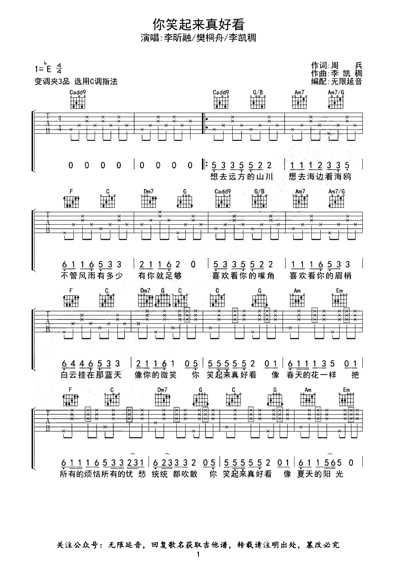 你笑起来真好看吉他谱 - 李昕融/李凯稠/樊桐舟 - C调吉他弹唱谱
