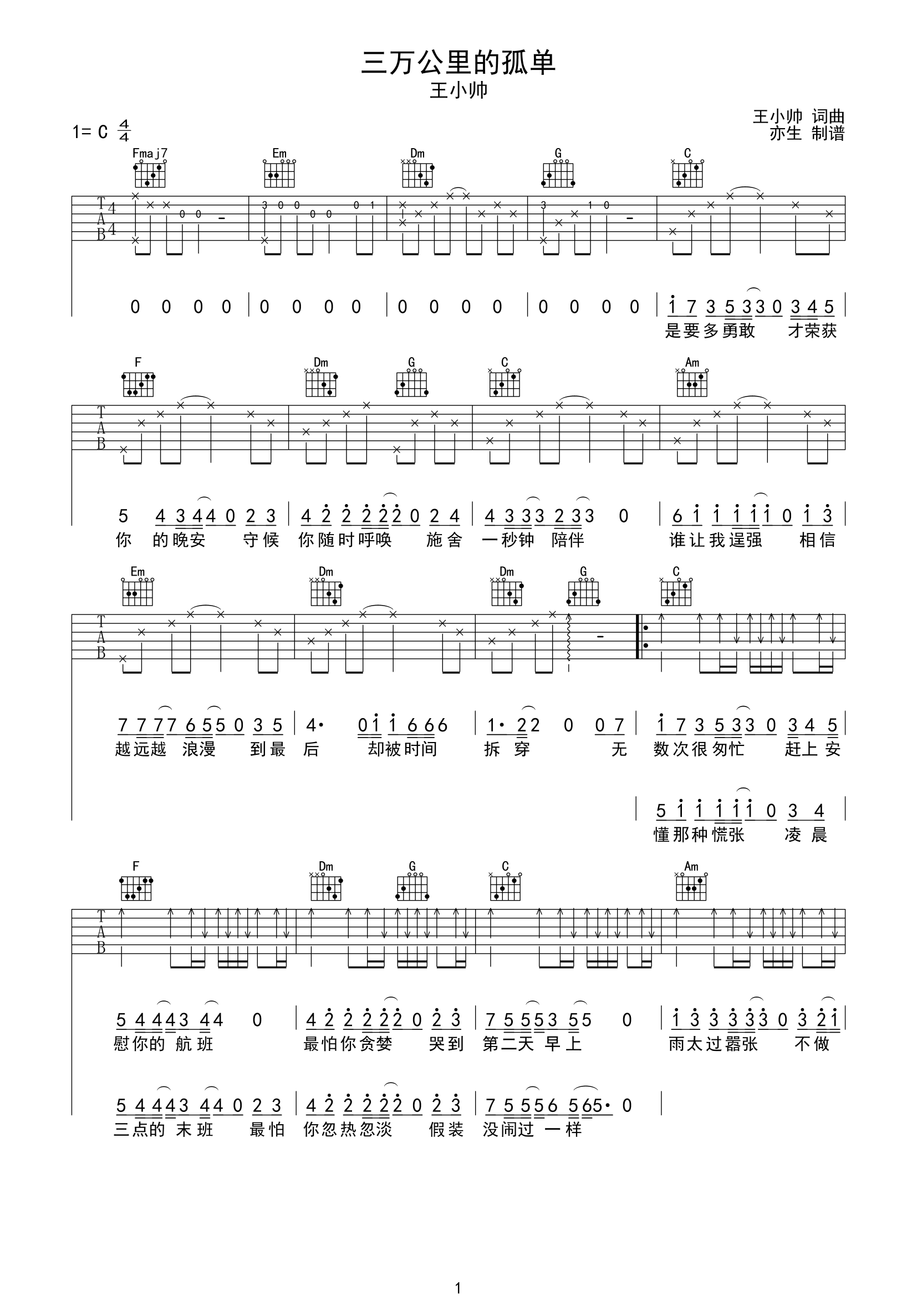 三万公里的孤单吉他谱 - 王小帅 - C调吉他弹唱谱