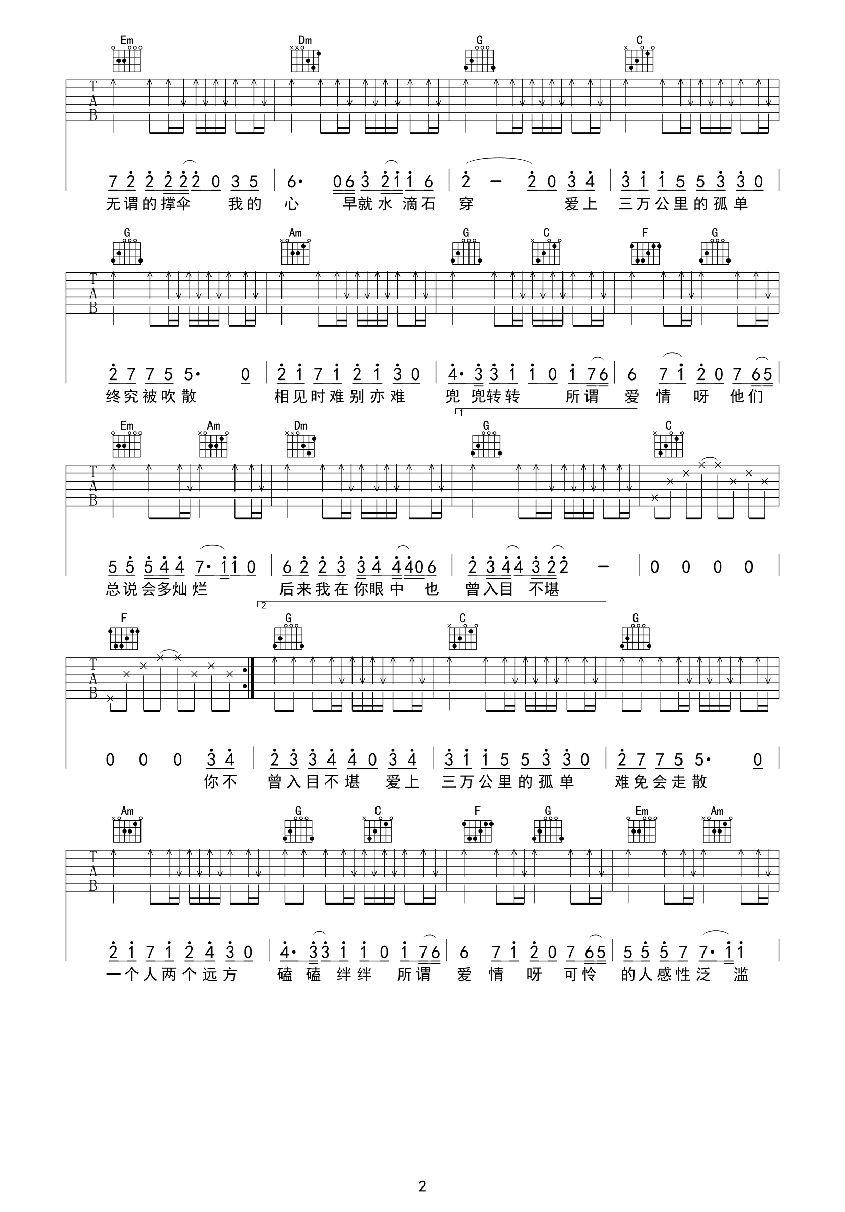 曲谱介绍: 《三万公里的孤单》吉他弹唱谱,选用C调指法,含完整的前奏,男生版编配,原调较高,弹唱可根据自己音域的水平选择变调夹位置,难度初级简单。