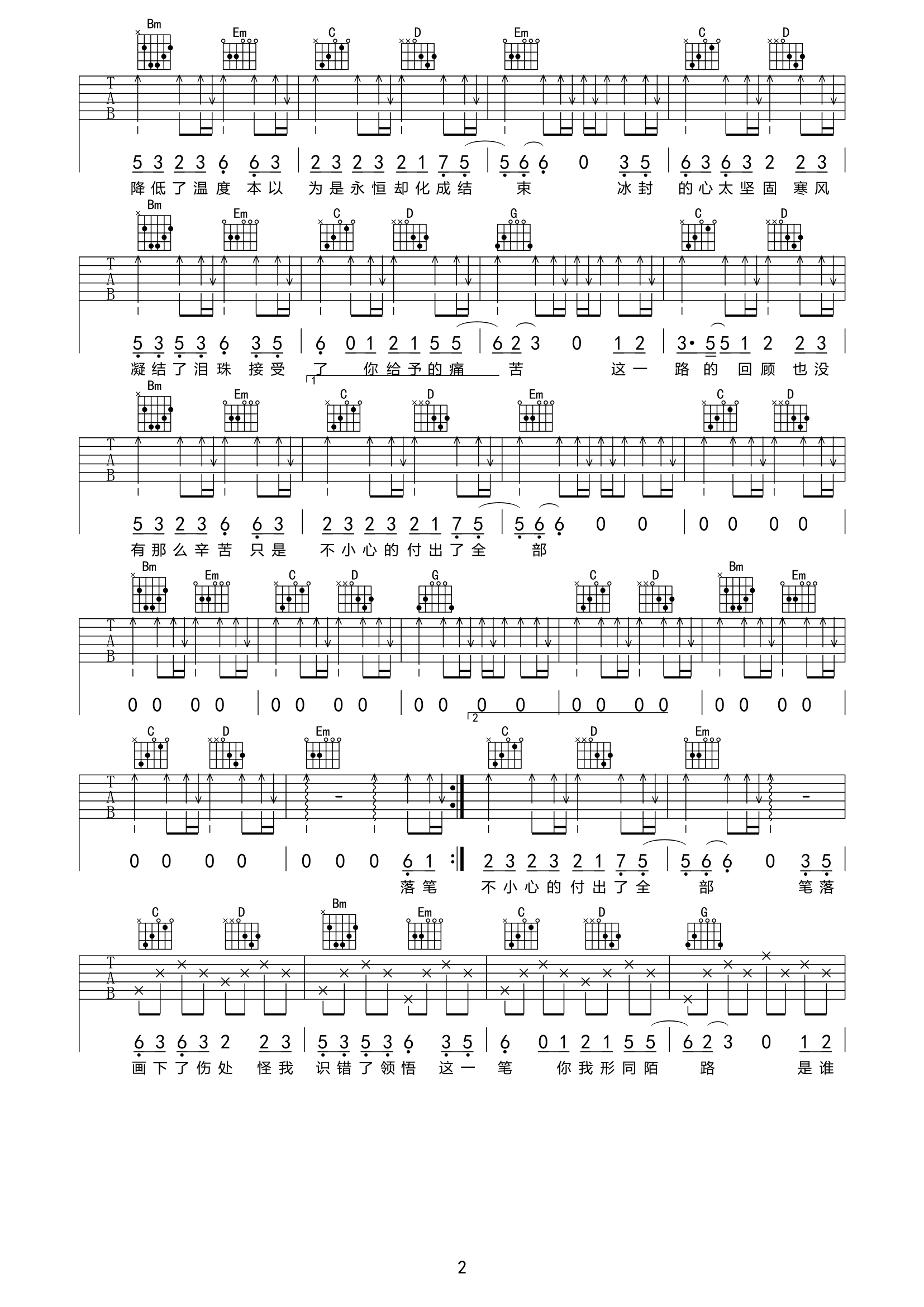 曲谱介绍: 笔落吉他谱,零一九零贰演唱的网络歌曲,国风+流行音乐的融合得恰到好处。落笔处相思故进退,爱恨的城府,写不尽的是我对你的投入,曾经美好的感情迅降温度,这一笔落下了从此的分割线,最终形同陌路。 《笔落》吉他弹唱谱,选用G调指法,标准调音可不用变调夹,含前奏的完整版本,难度初级较简单,共3张高清图片谱例。