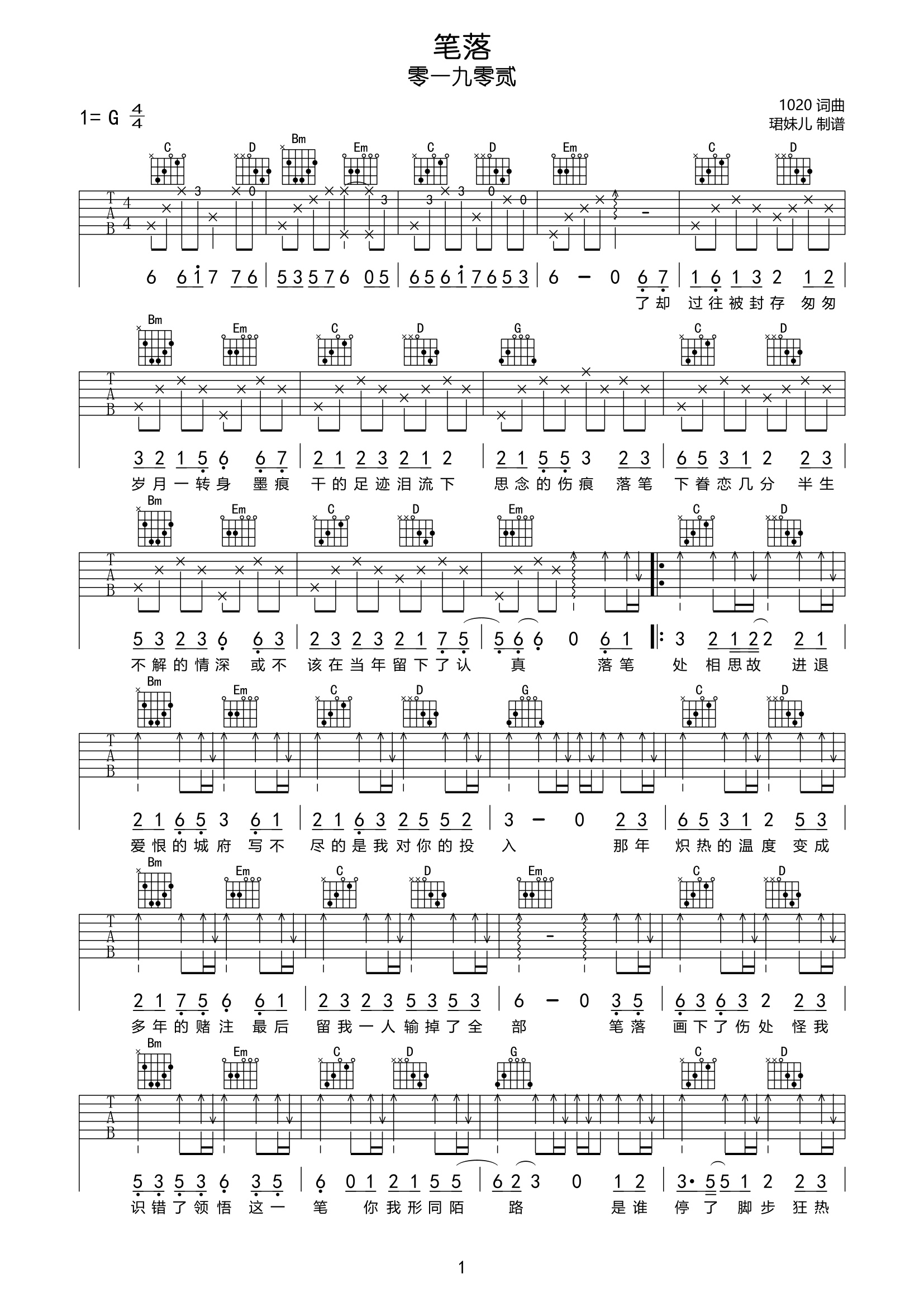 笔落吉他谱 - 零一九零贰 - G调吉他弹唱谱