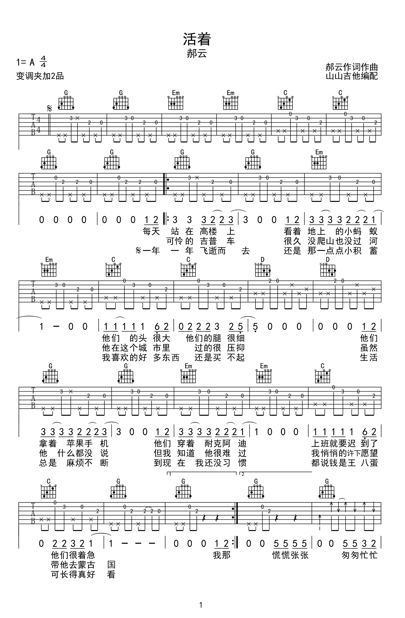 曲谱介绍: 活着吉他谱,共3张高清图片谱,选用G调指法,原调A调,建议变调夹夹2品弹唱,节奏4/4拍,难度初级简单。