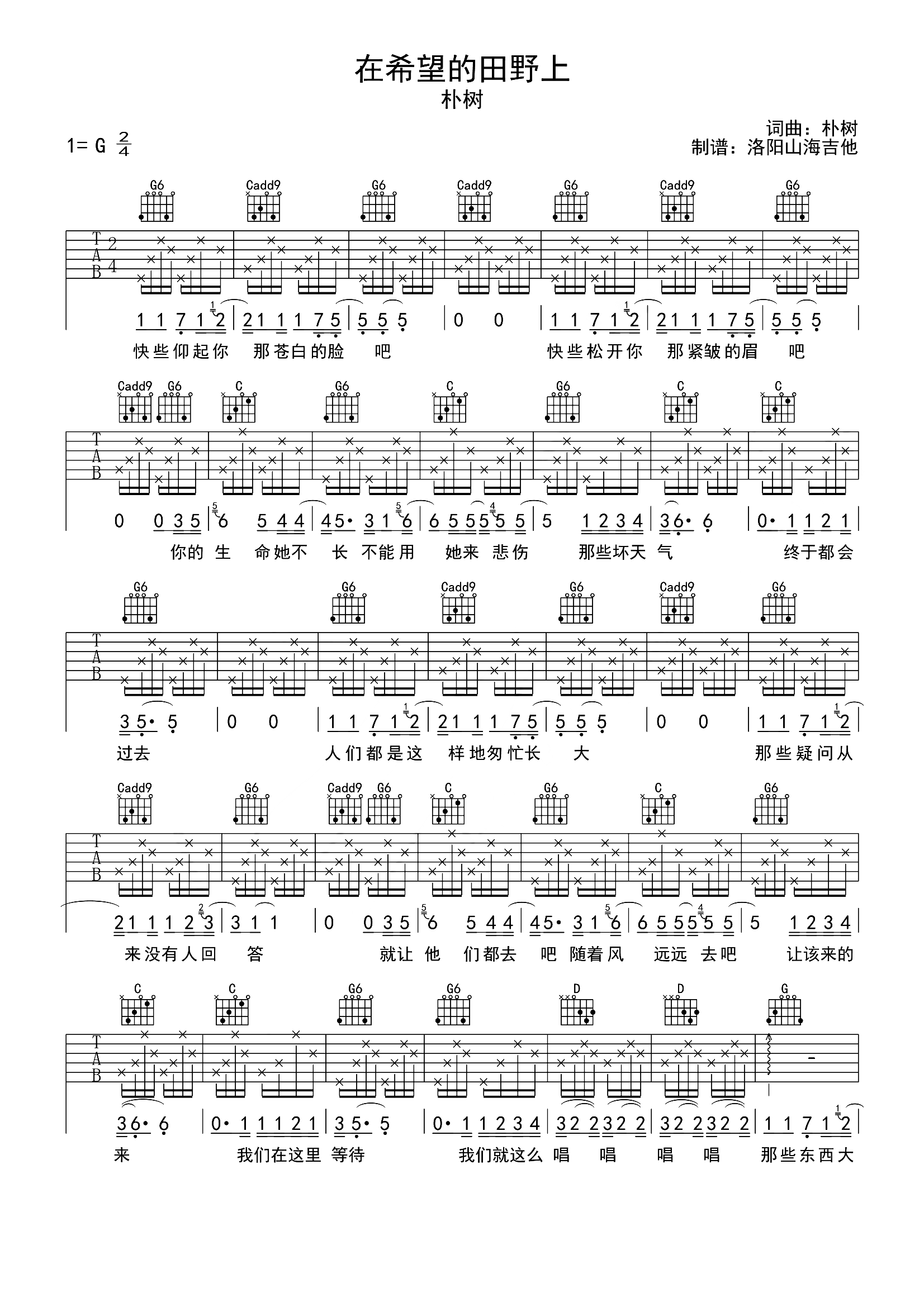 在希望的田野上吉他谱 - 朴树 - G调吉他弹唱谱