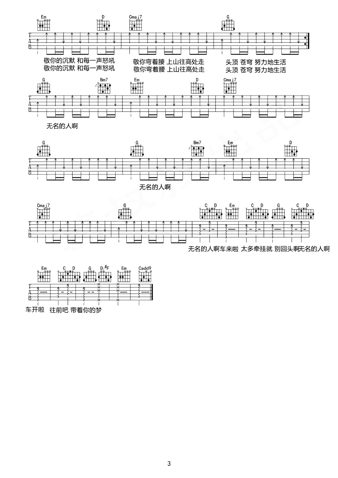 曲谱介绍: 无名的人吉他谱,毛不易演唱的《雄狮少年》电影主题曲,选用G调指法,原调A调,CAPO推荐夹2品弹唱原调,由葛叔叔制谱的版本,难度初级较简单,本谱共3张高清PNG六线谱。 简单的和弦和歌词,唱出了不一样的感动,给了所有平凡普通却顶天立地的人一份温暖的礼物。音乐的魅力大概就在于它总能述说出人们那些无法言喻的,难以诉说的情绪,恰到好处的弦乐给人满满舒适感,治愈了多少人的内心。