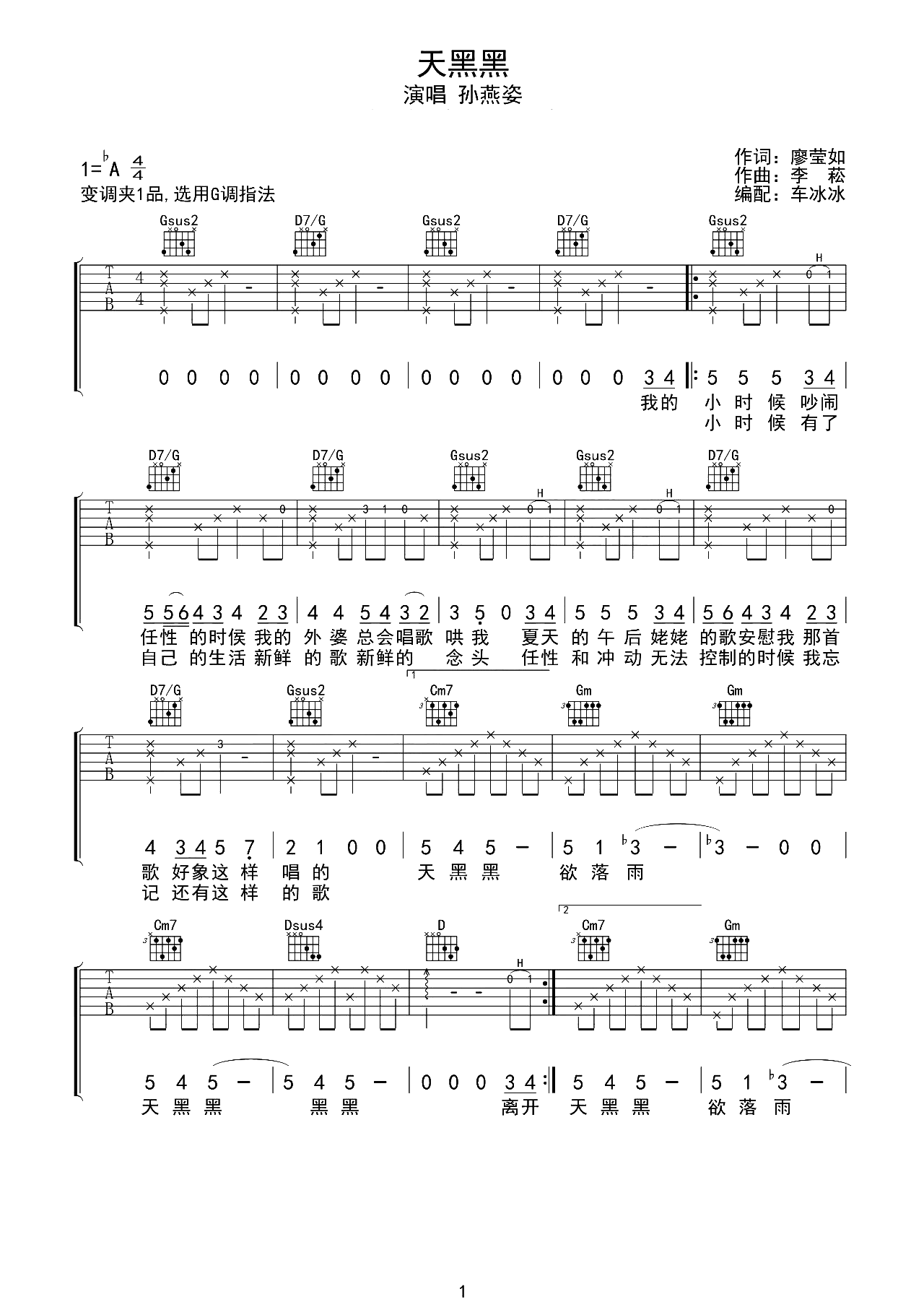 天黑黑吉他谱 - 孙燕姿 - G调吉他弹唱谱