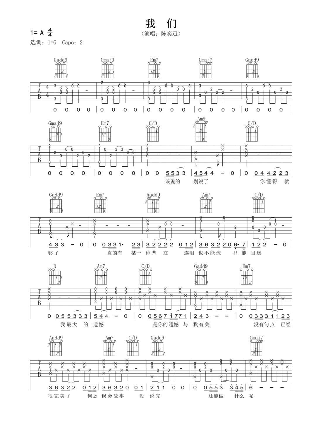 曲谱介绍: 我们吉他谱,陈奕迅演唱,是电影《后来的我们》主题曲,《我们》吉他弹唱谱,选用G调,原调A调,CAPO推荐2品,本谱按原版编配,细节较多,弹唱难度适中,共2张高清PNG图片谱例。