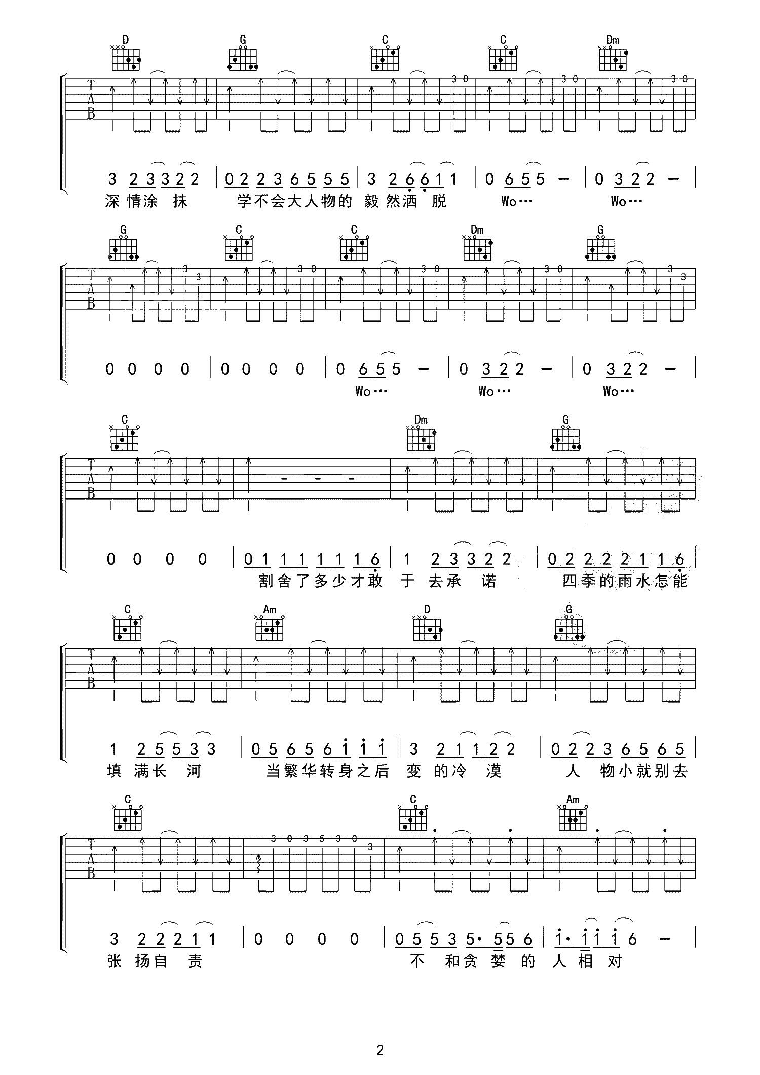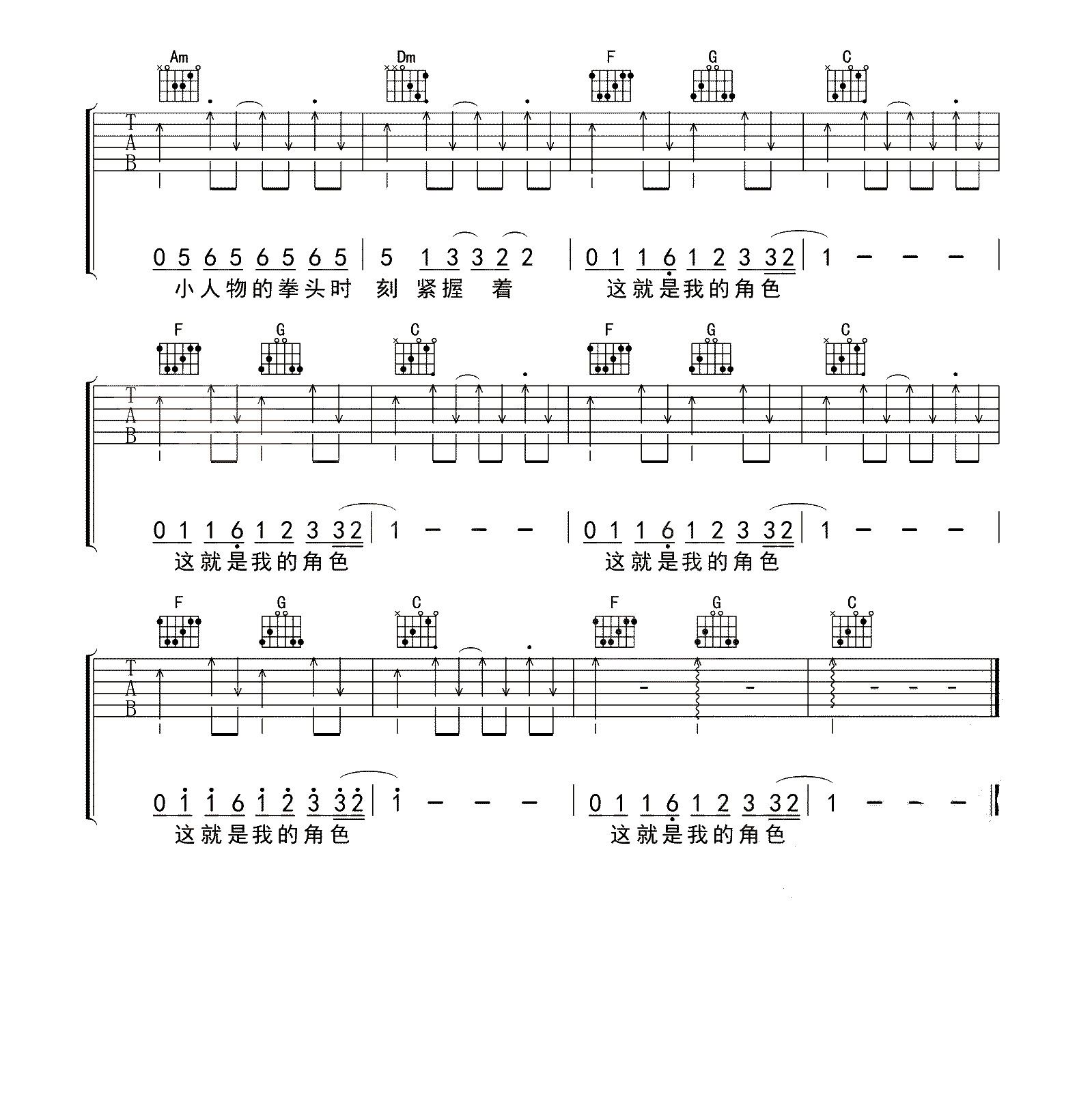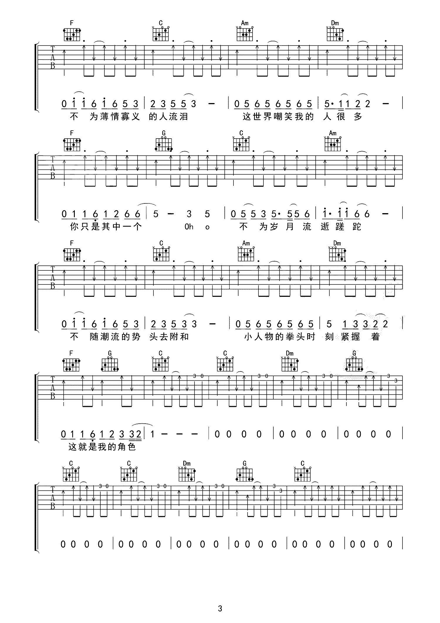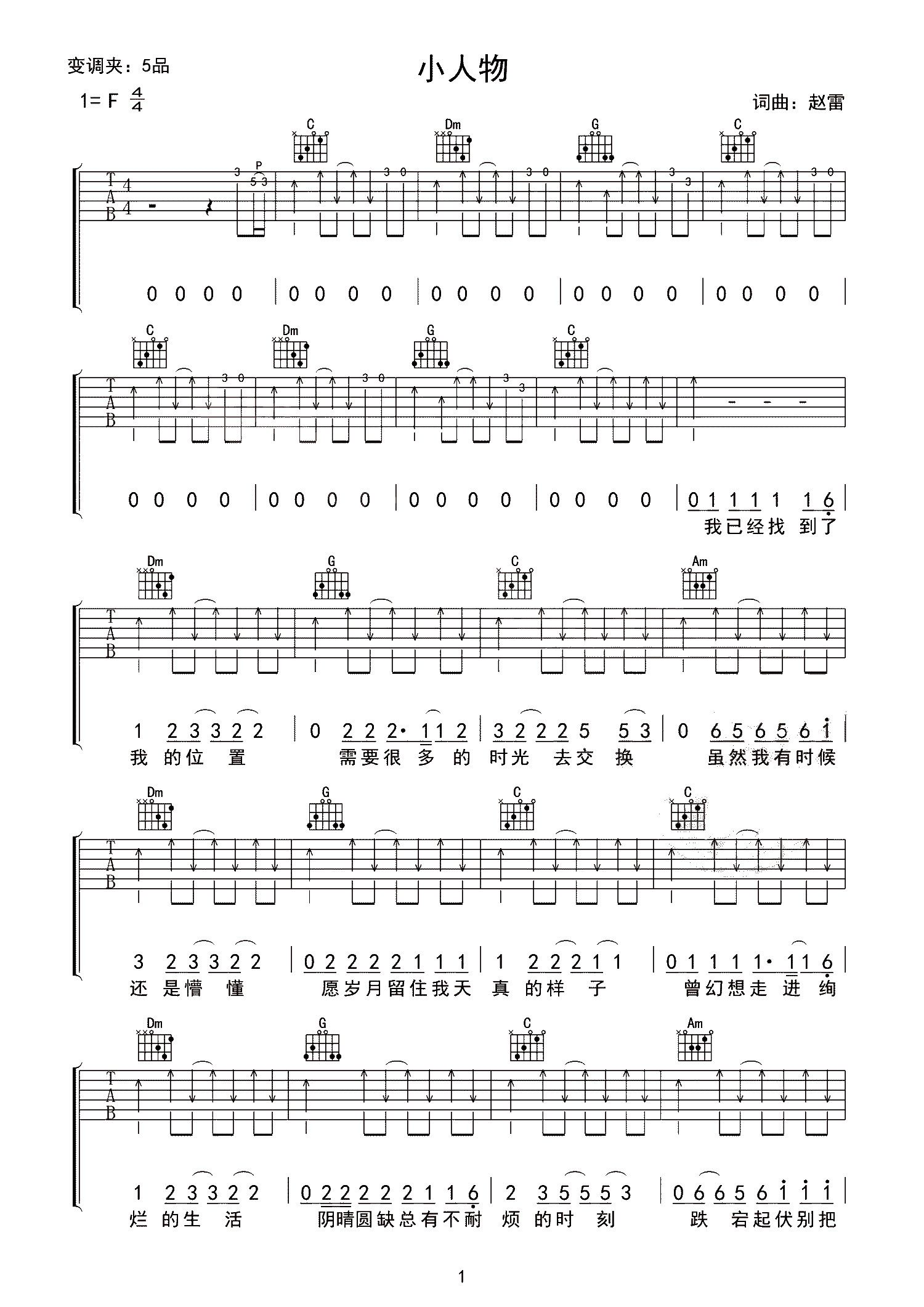 曲谱介绍: 小人物吉他谱,赵雷一首叙事民谣,歌曲层次叠起,没有像过往歌曲的沉静,词藻似乎从未打算修饰,每句歌词没有安排韵脚,通过丰富的故事化尽情的表达着“小人物”的内心世界及变化,生活中我们可能都是“小人物”,但依然要怀揣一个大大的梦想。 《小人物》吉他弹唱谱,选用C调指法编配,原调F调,变调夹建议夹5品弹唱,本谱按原版编配,弹唱难度适中,扫弦部分加入了切音的技巧,尽量不要省略节奏,共有5张高清PNG图片谱例。