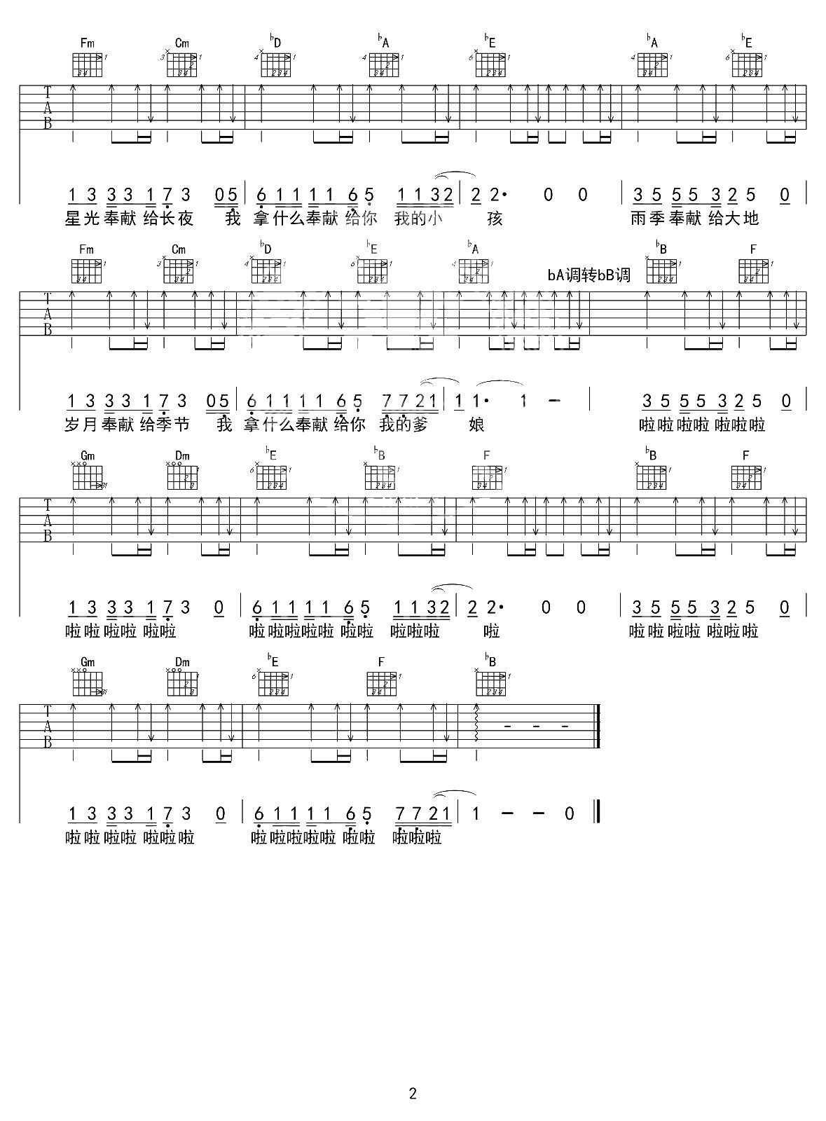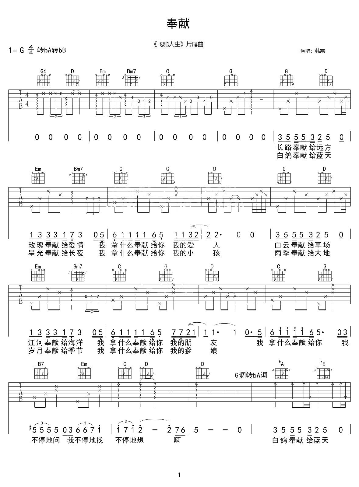 曲谱介绍: 奉献吉他谱,韩寒演唱《飞驰人生》的电影片尾曲 《奉献》六线谱,选用G转bA转bB调指法编配,中间和弦级的跨度变化较多,按原版编配含前奏,弹唱难度适中,共2张高清PNG图片谱图例。