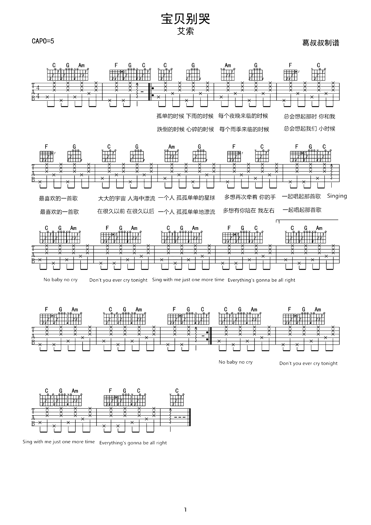 宝贝别哭吉他谱 - 艾索 - C调吉他弹唱谱