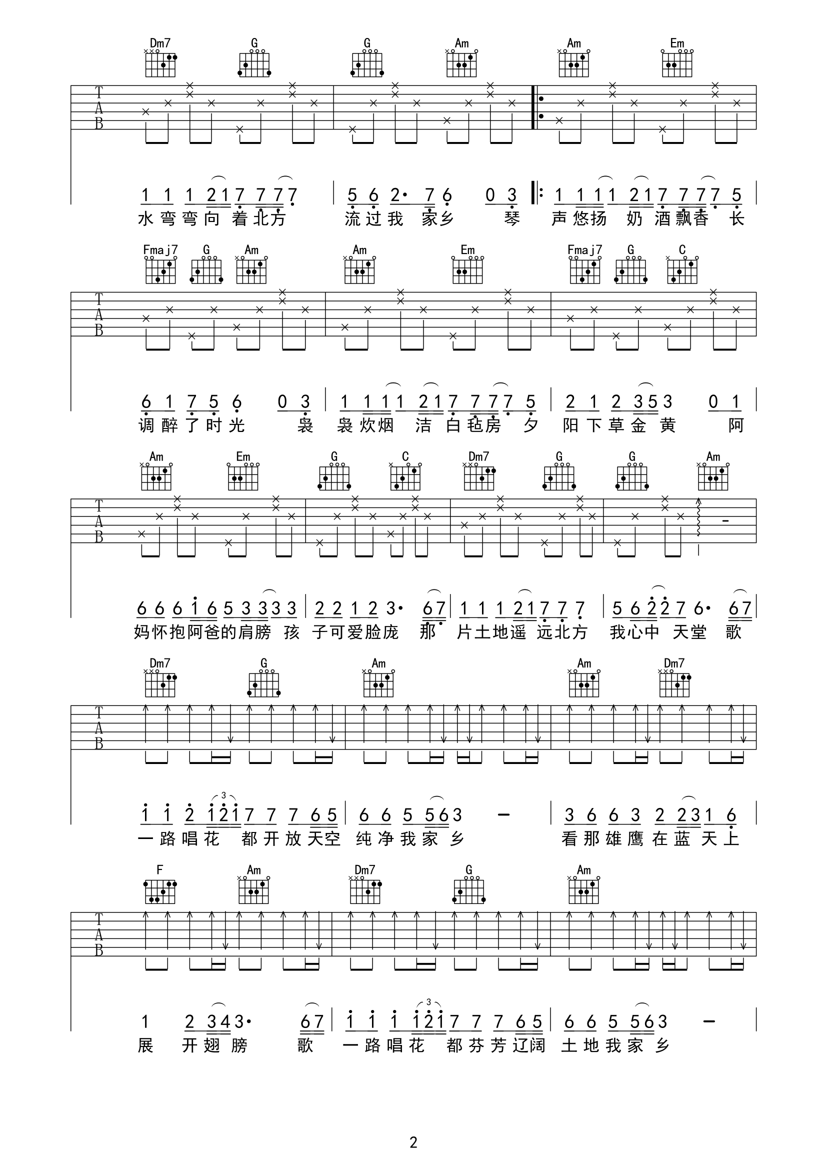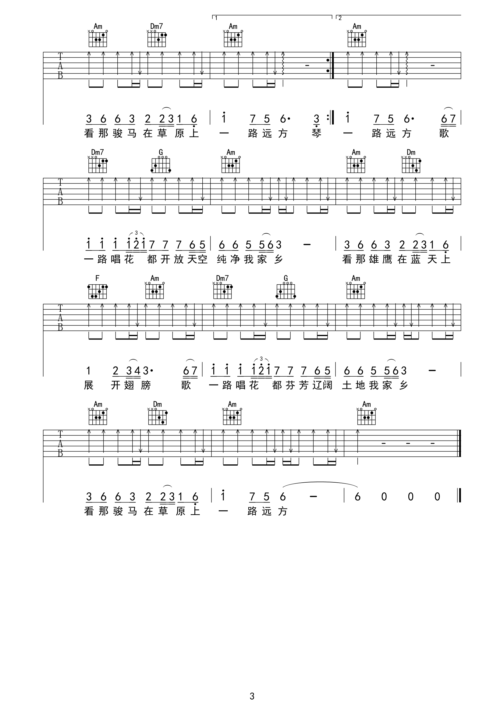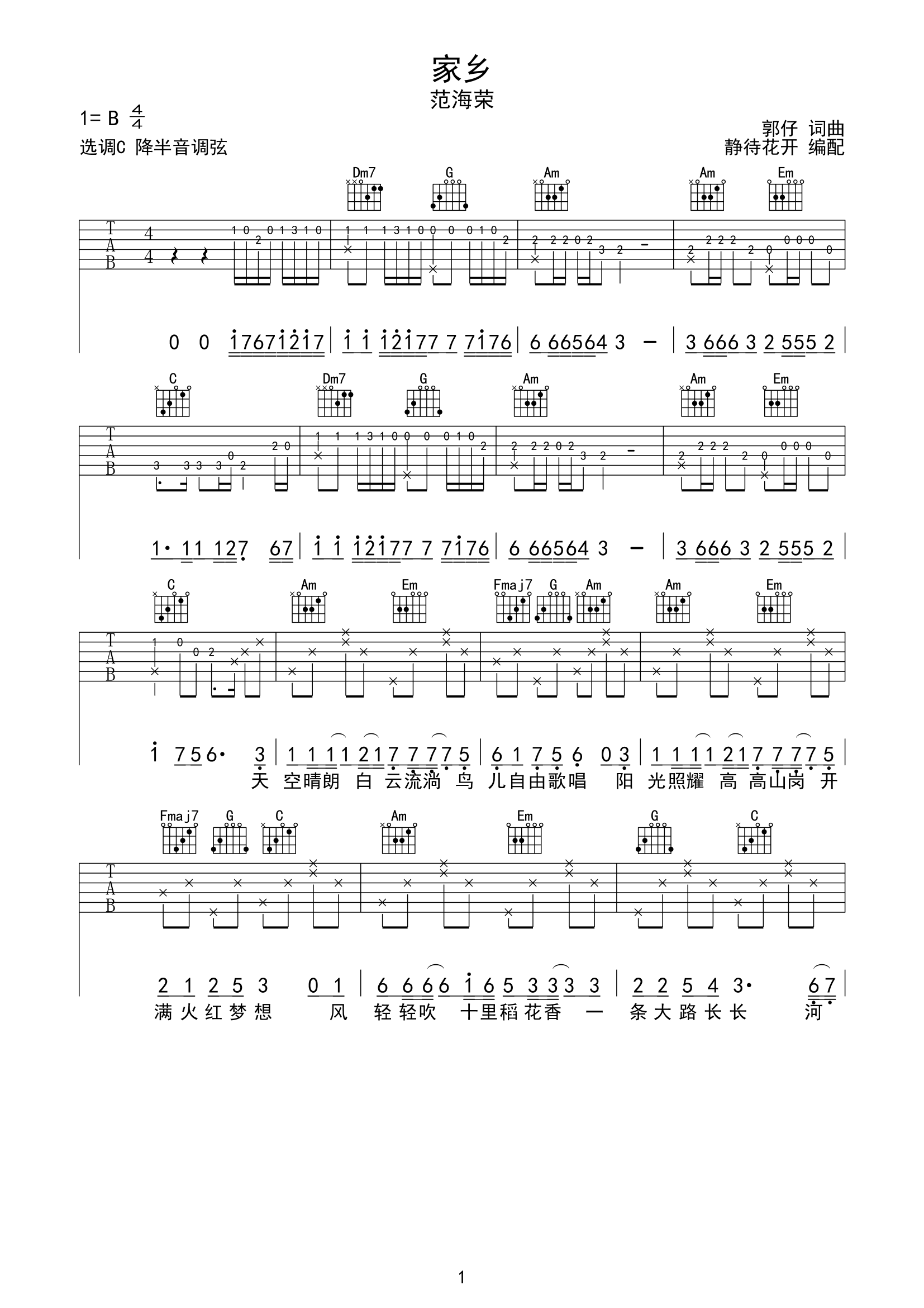 曲谱介绍: 家乡吉他谱,范海荣演唱关于“家乡”的一首歌,由郭仔作词作曲,畅快阳光的节奏,唱着的是家乡的美好,琴声悠扬,奶酒飘香,看那雄鹰在蓝天上展翅飞翔。 《家乡》吉他弹唱谱,共三张高清六线谱,含完整前奏,按原版编配,选用C调,原调B调,弹唱原调需降半音调弦,难度初级较简单。