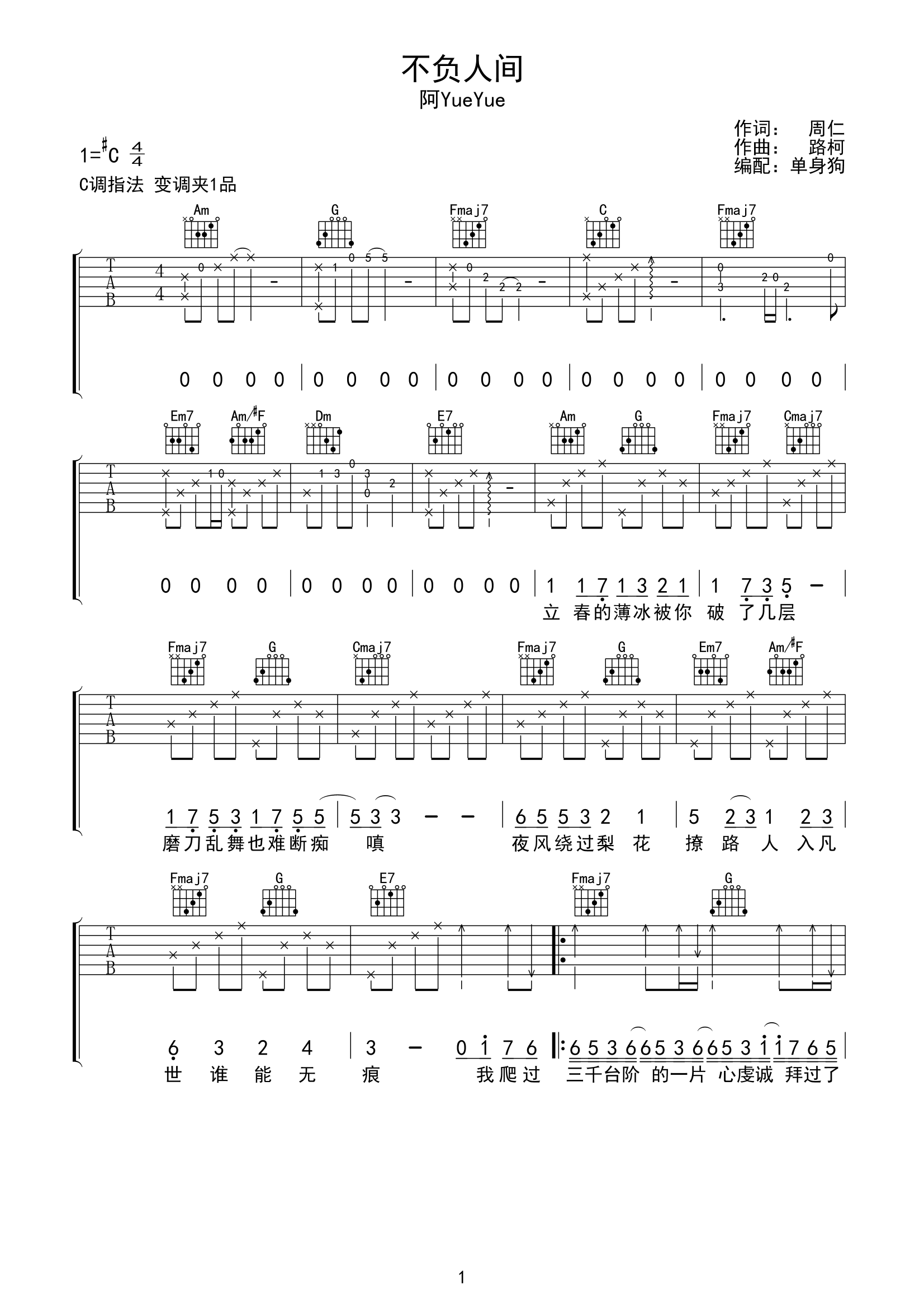 不负人间吉他谱 - 阿yueyue - C调吉他弹唱谱 - 原版