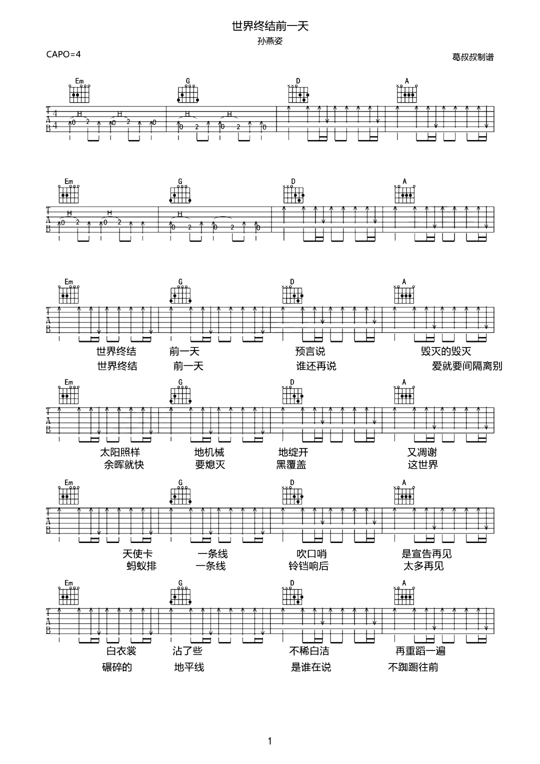 曲谱介绍: 在《世界终结前一天》中,孙燕姿运用都市寓言的叙事模式,将非传统现象转化为创作主题,记录了全球疫情保护的日子,并用英国摇滚乐风格描述了生活形式的突然变化。歌曲同时也没有失去人们的心灵温度,传达了一种希望和力量。 世界终结前一天吉他谱,选用C调,原调E调,《世界终结前一天》吉他六线谱,以扫弦版进行编配,含简易前奏,弹唱难度初级较简单,共2张高清PNG图片谱。