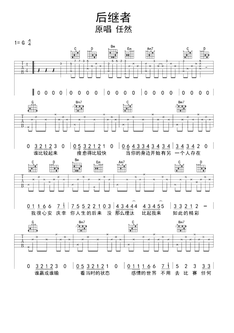 曲谱介绍: 任然《后继者》吉他谱,任然演唱的一首伤感疗愈情歌。 《后继者》吉他弹唱谱,选用G调指法,标准调音可不用变调夹,共3张高清图片谱例,按原版编配,难度初级较简单。
