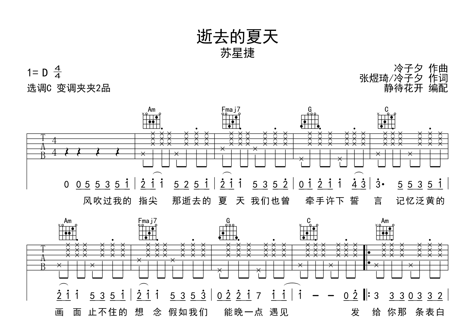 曲谱介绍: 逝去的夏天吉他谱,苏星捷演唱,《逝去的夏天》吉他弹唱谱,原调D调,采用C调和弦指法编配,变调夹夹第2品,演奏速度大约每分钟85拍,难度简单。