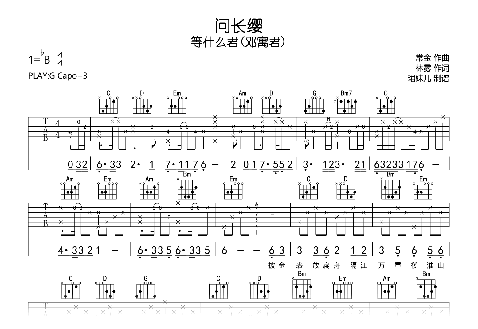 曲谱介绍: 问长缨吉他谱,等什么君(邓寓君)演唱,诸君谈笑起 何须问长缨。《问长缨》吉他弹唱谱,原调bB,采用G调指法编配,建议变调夹3品,速度85BPM,较简单易上手。