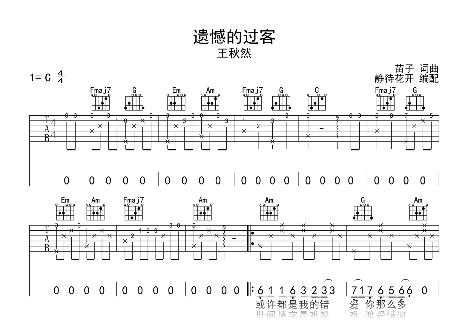曲谱介绍: 遗憾的过客吉他谱,王秋然演唱,《遗憾的过客》吉他弹唱谱,编配采用C调和弦指法,演奏不夹变调夹,演奏速度大约每分钟85拍,演奏难度简单。