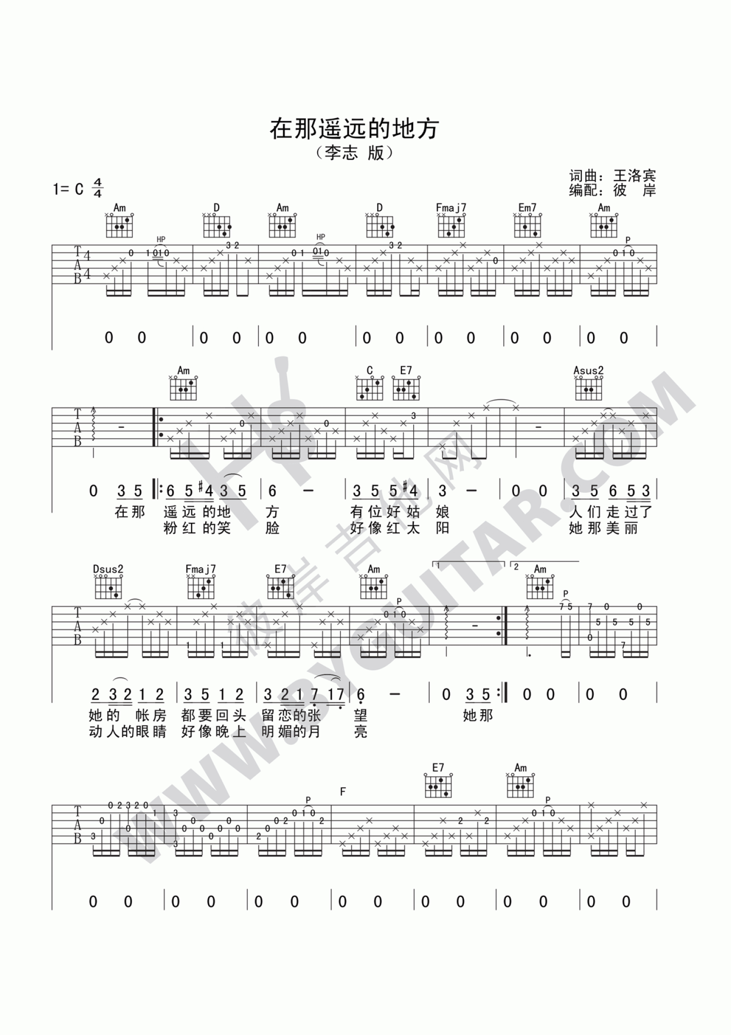 曲谱介绍: 在那遥远的地方吉他谱 C调李志版