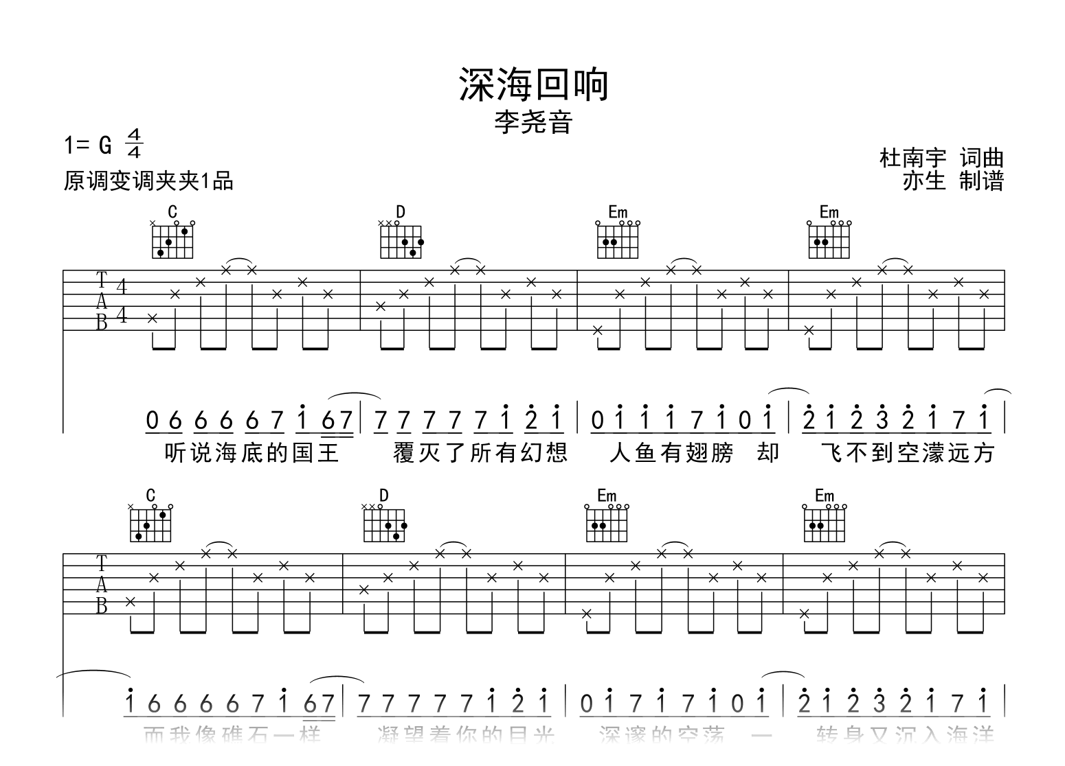 深海回响吉他谱 - 李尧音 - G调吉他弹唱谱