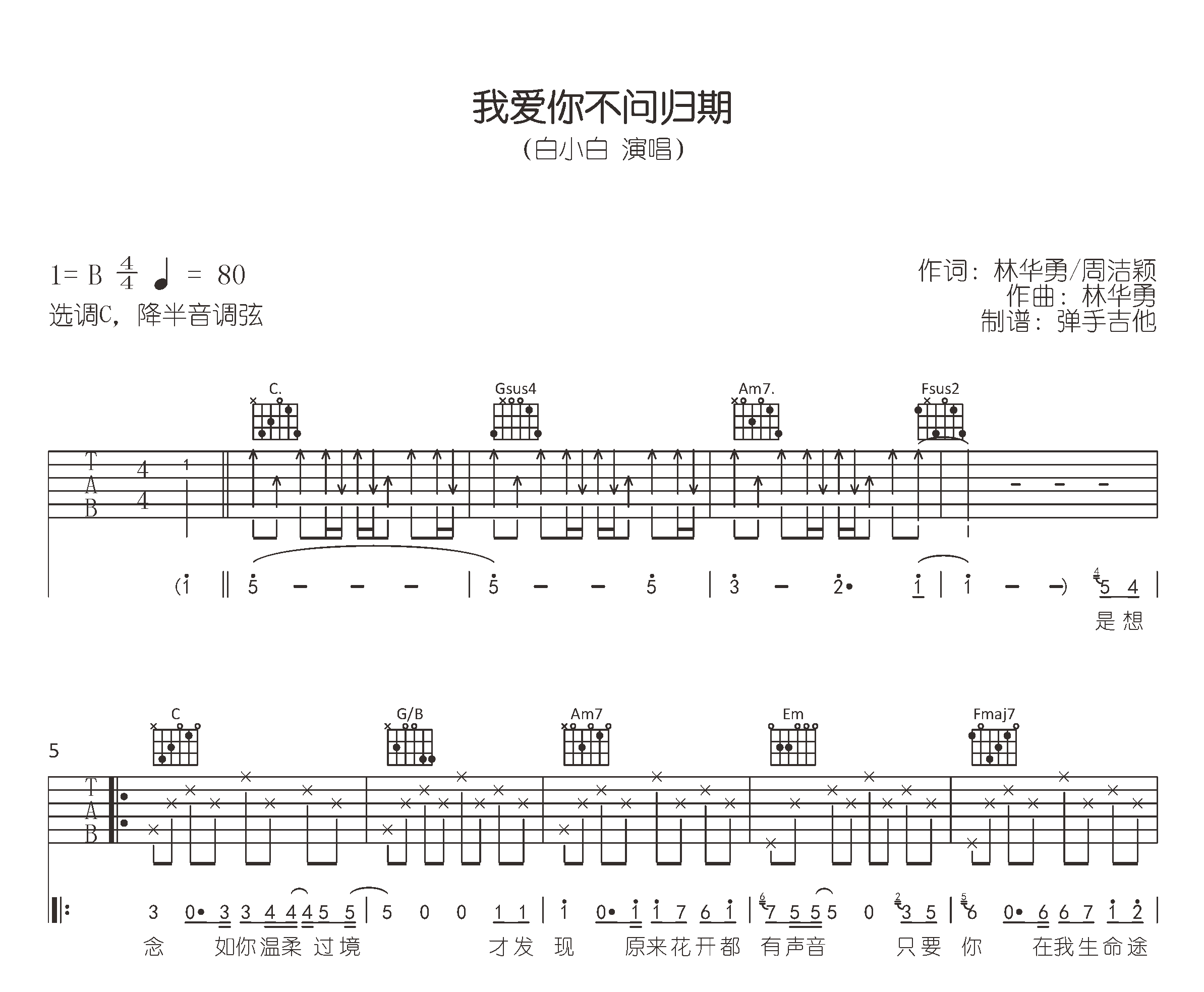 曲谱介绍: 我爱你不问归期吉他谱,白小白演唱的一首网络热门歌曲,《 我爱你不问归期》吉他弹唱谱,原调B,原版精编了C调和G调两个版本,方便琴友们参照练习。喜欢的别错过收藏。