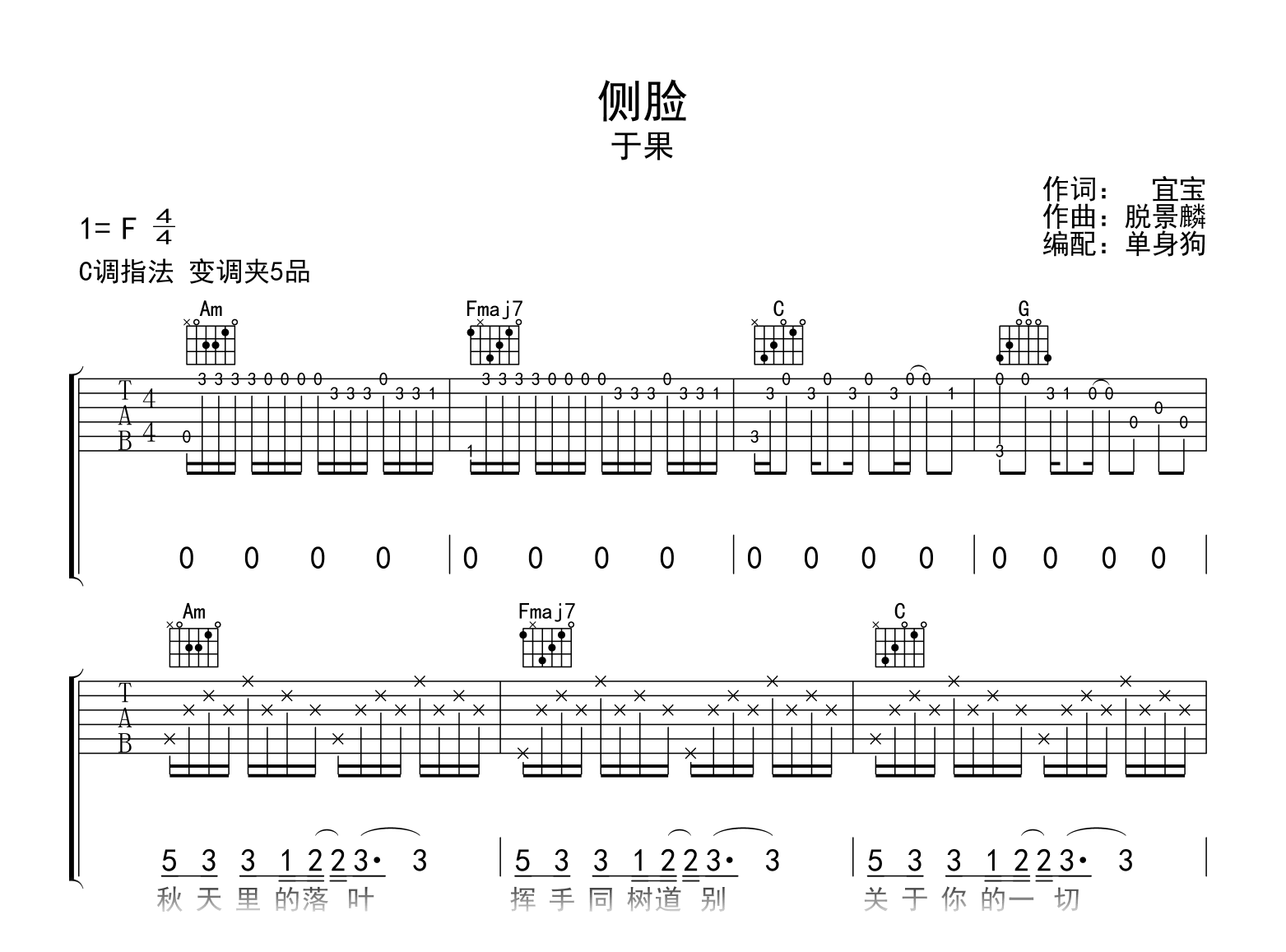 侧脸吉他谱 - 于果 - C调吉他弹唱谱