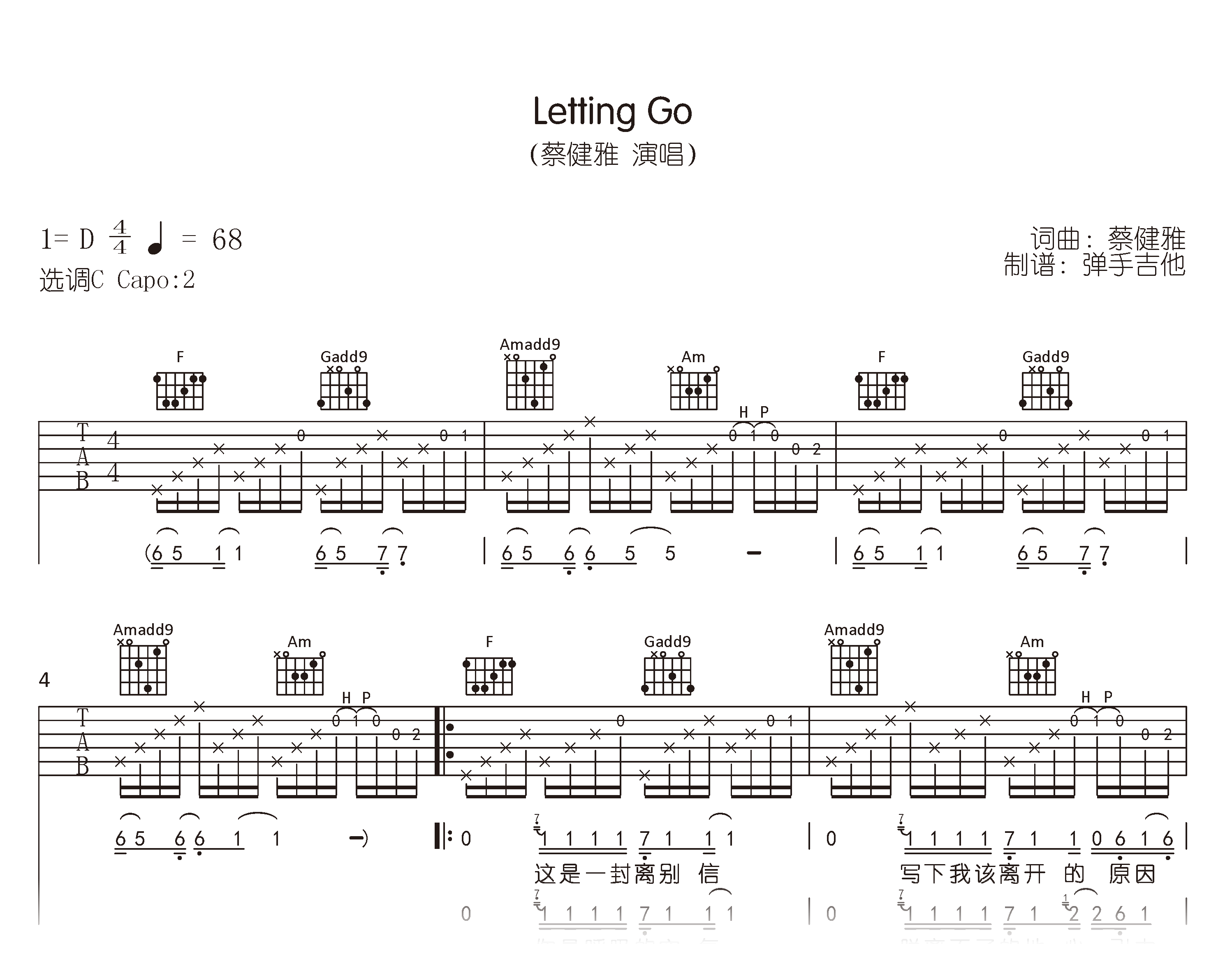 曲谱介绍: Letting Go吉他谱,蔡健雅演唱的经典情歌,《Letting Go》吉他弹唱谱,原调D,选用C调和弦指法,Capo夹二品,注意和弦中的过渡音与特殊和弦的按法。 温柔忧郁的旋律、伤感动人的歌词,最近在短视频又经常听见。整首没有什么撕心裂肺的片段,但是淡淡轻轻地唱着,表达出不舍和犹豫的决绝,用情至深后,那种忽然醒悟的悲伤。