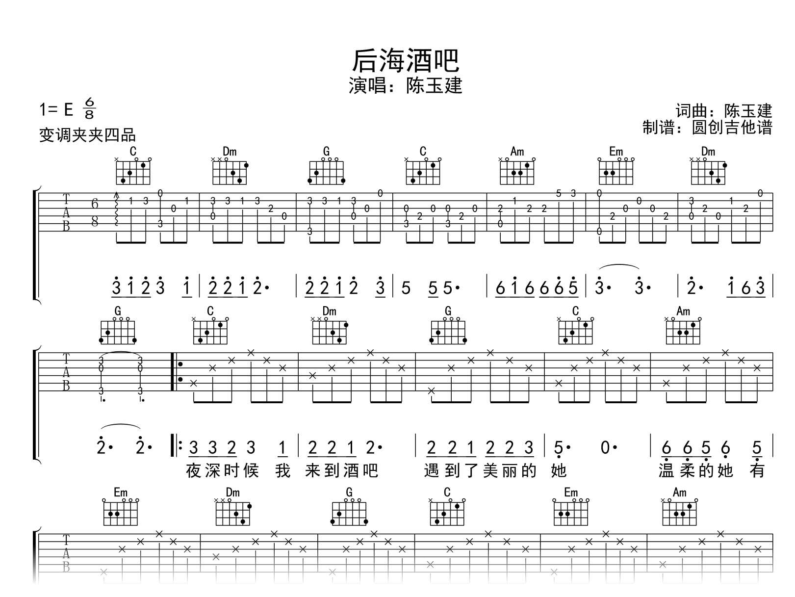 曲谱介绍: 后海酒吧吉他谱,陈玉建演唱的一首网络歌曲,《后海酒吧》吉他弹唱谱,原调E,选用C调指法,变调夹夹四品就是原调。随谱附上音频示范,琴友们参考练习。 好听而又弹唱简单的歌曲推荐,浪漫的歌声,流露出对爱情的向往,没有成都小酒馆的忧伤,更多是后海酒吧的无奈。