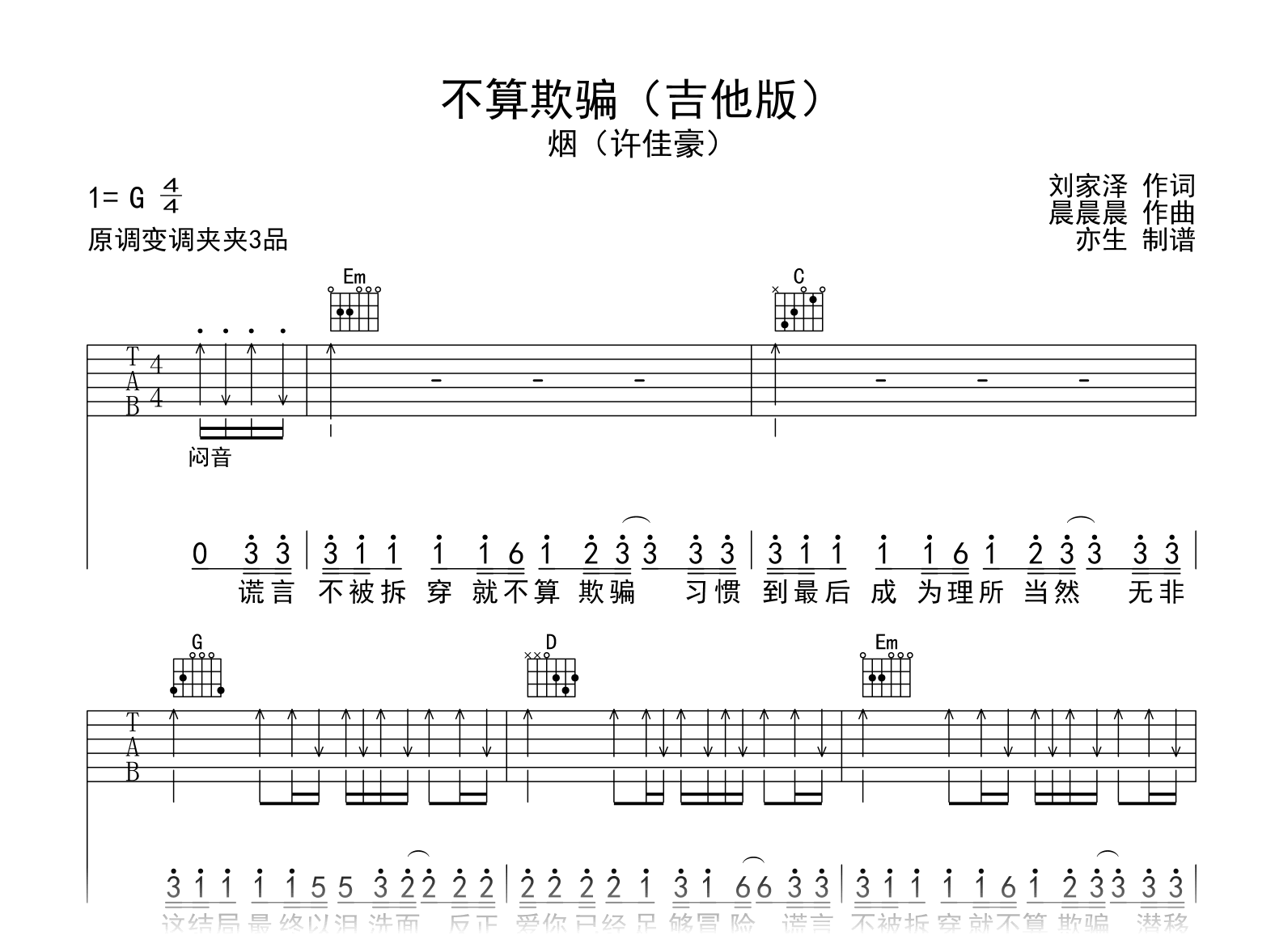 曲谱介绍: 不算欺骗吉他谱,烟(许佳豪)演唱的一首歌曲吉他版,《不算欺骗》吉他弹唱谱,选用G调和弦指法编配,变调夹夹第3品,节奏4/4拍,演奏速度大约每分钟95拍,难度为简单。高清图片谱共两张。