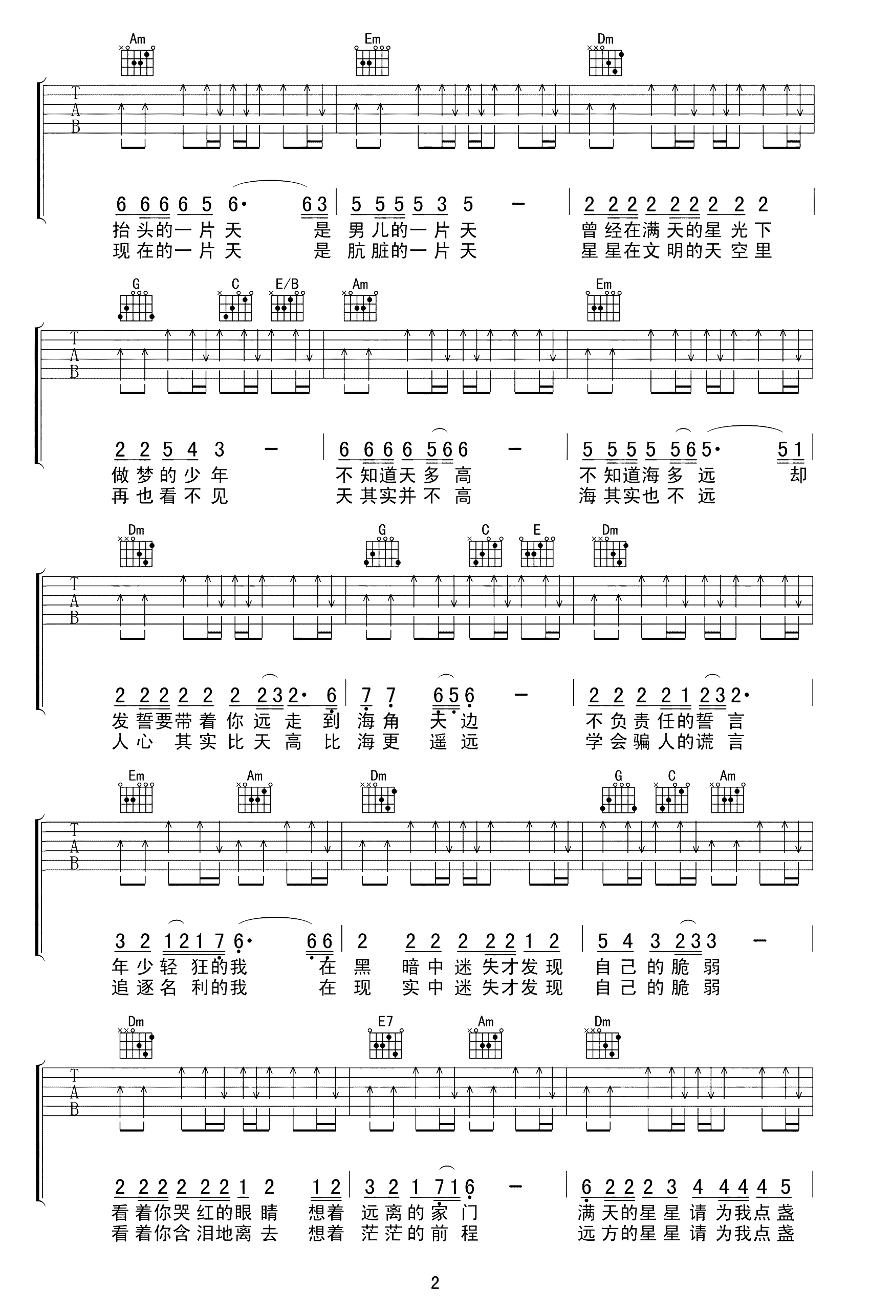 曲谱介绍: 郑智化《星星点灯》,一首经典的励志歌曲,每个男儿都曾经在黑暗之中被梦想的光照亮,但是现实总是在不断的让我们感受到了黑暗的讽刺,在迷失的路途之中,愿星星能够点亮“心”光,指引前方。 星星点灯吉他谱,共有四张图片谱,选用C调指法,原调E转F调,所以建议变调夹可夹4品弹唱原调,按原版编配,难度较简单。