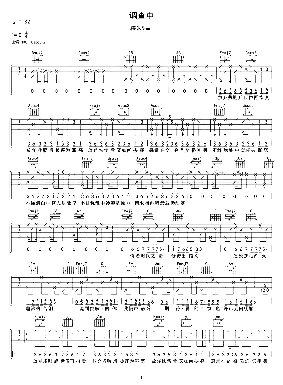 调查中吉他谱 - 糯米Nomi - 吉他弹唱谱 - 原版