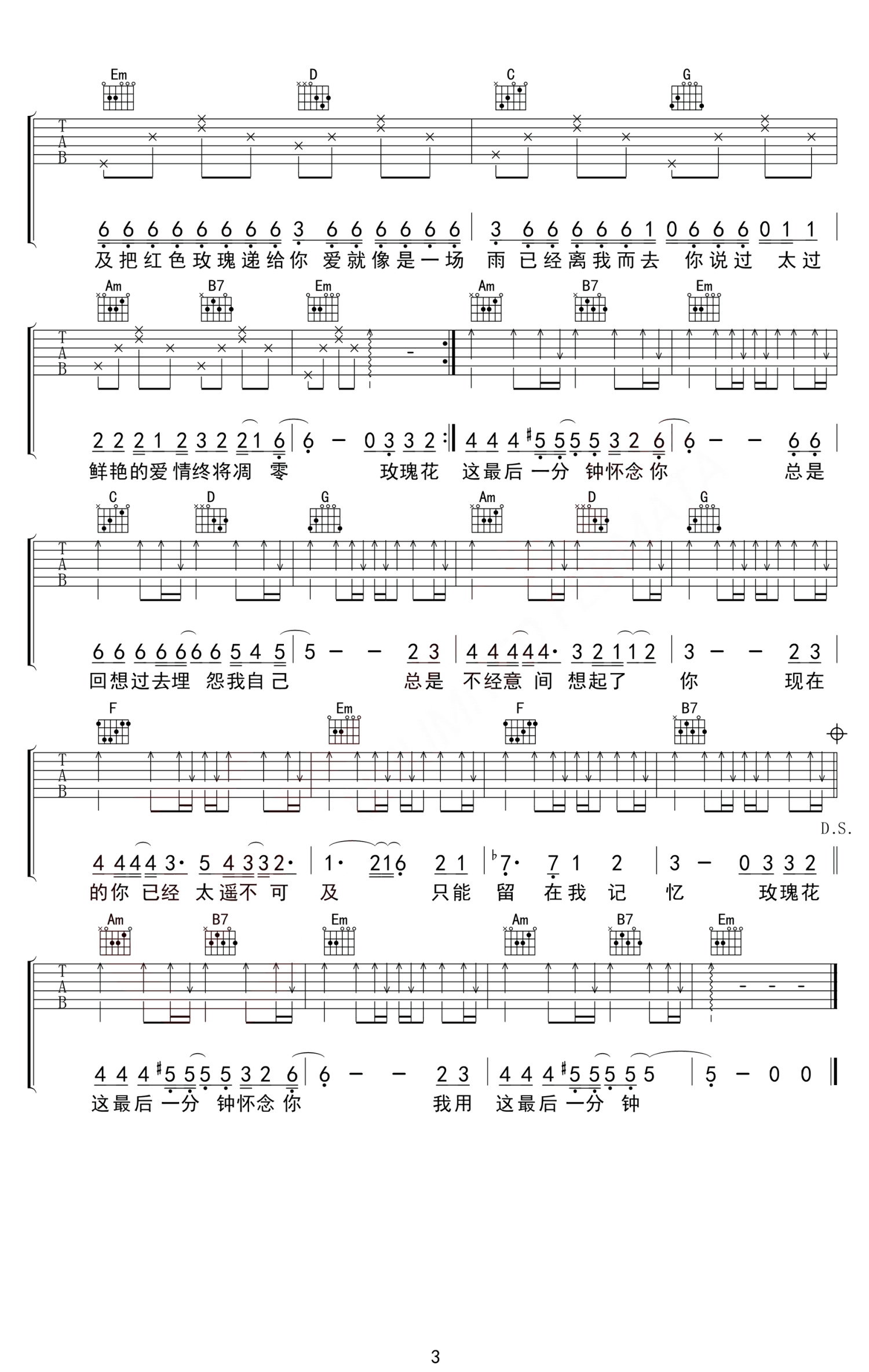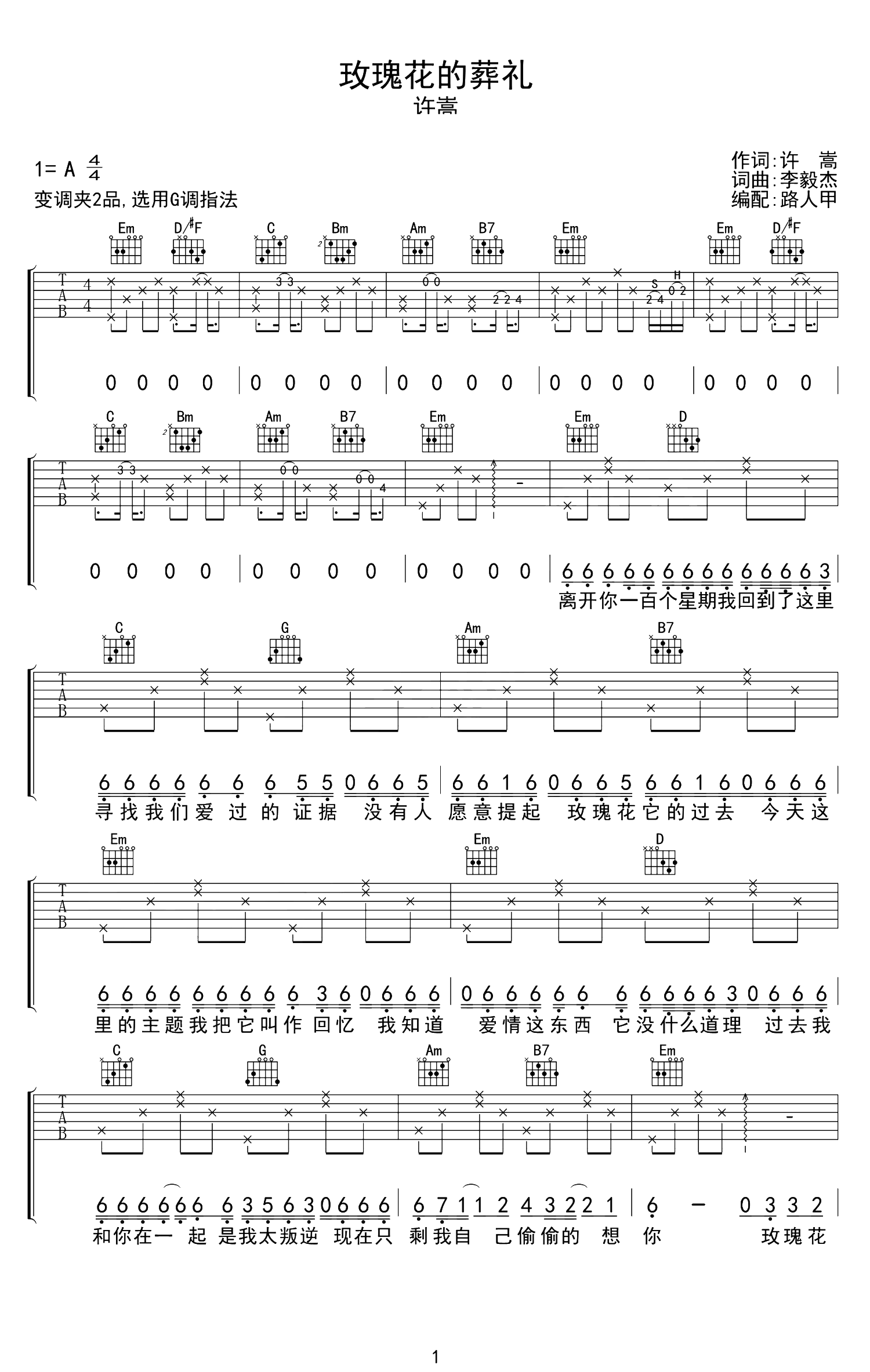 曲谱介绍: 许嵩《玫瑰花的葬礼》吉他谱,这首歌陪伴着我们青春的记忆,曾经觉得像极了JAY的曲风,让许嵩在当时吸粉颇多,玫瑰花从来象征着浓郁的爱情,可有些爱情总在花开之后就瞬间凋零,最后掩埋成为彼此无法忘却的回忆。 《玫瑰花的葬礼》吉他弹唱谱,由无限延音制谱,总共三张六线图片谱,选用G调指法,原调A调,建议变调夹夹2品弹唱原调,本谱按原版编配含完整前奏,难度初级。