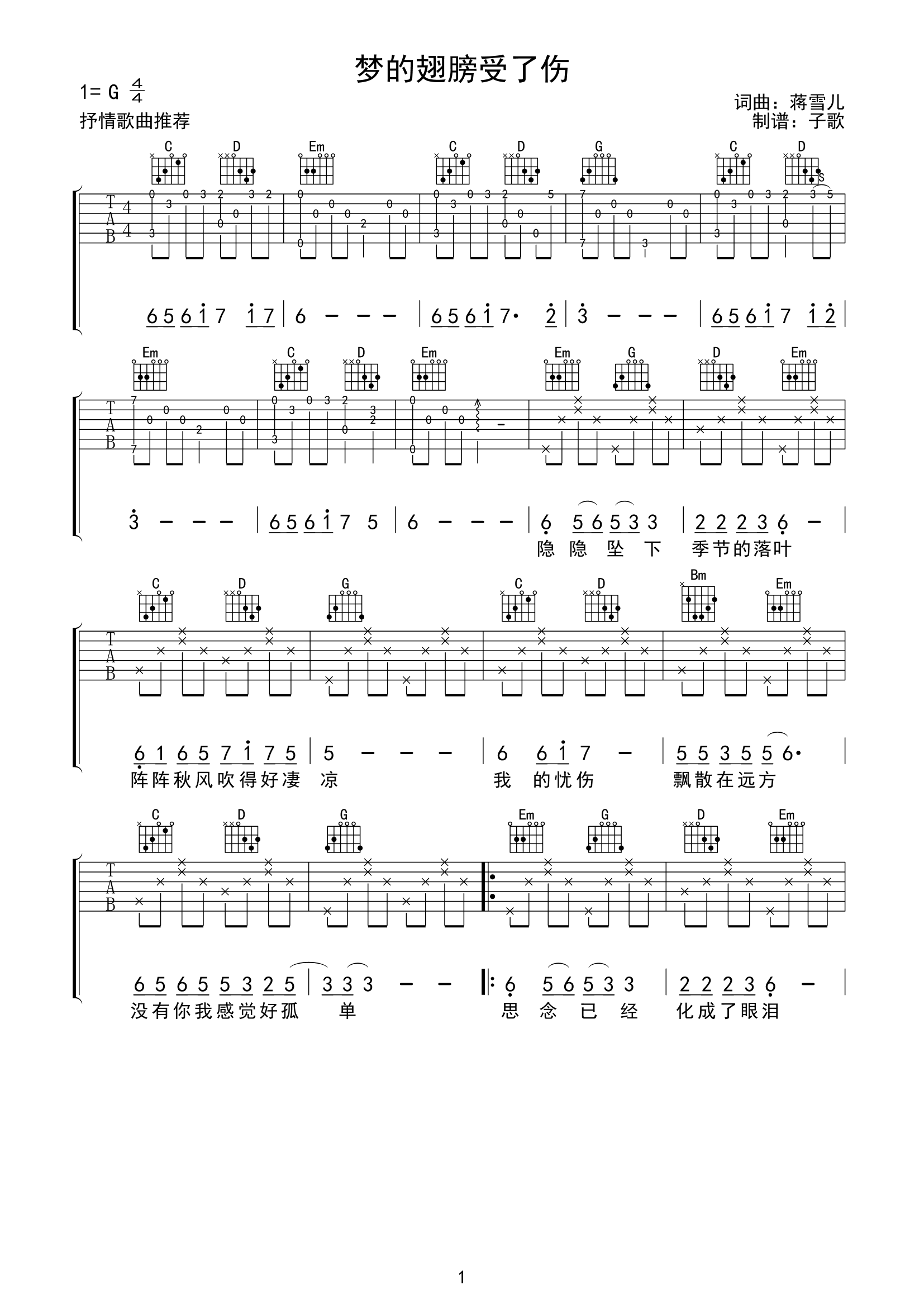 梦的翅膀受了伤吉他谱 - 蒋雪儿 - G调吉他弹唱谱