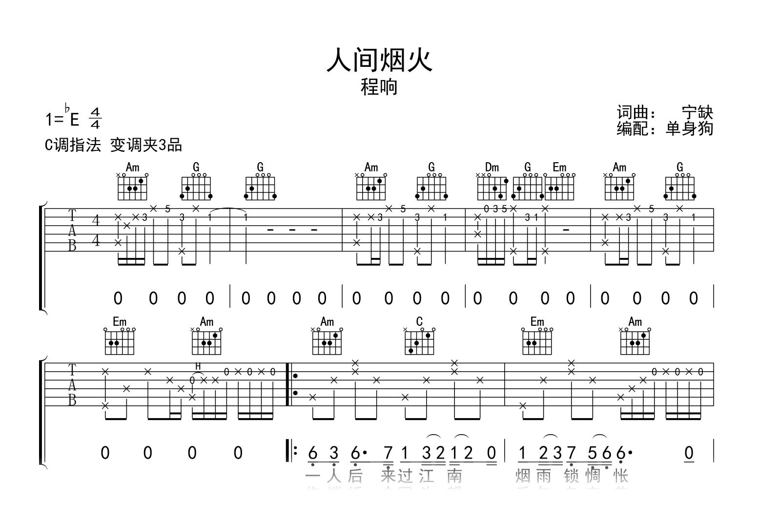 曲谱介绍: 人间烟火吉他谱,程响演唱,一首国风古韵的歌曲。《人间烟火》吉他弹唱谱,原调bE,选用C调和弦指法编配,变调夹夹三品,高清六线谱共两张图片谱例。