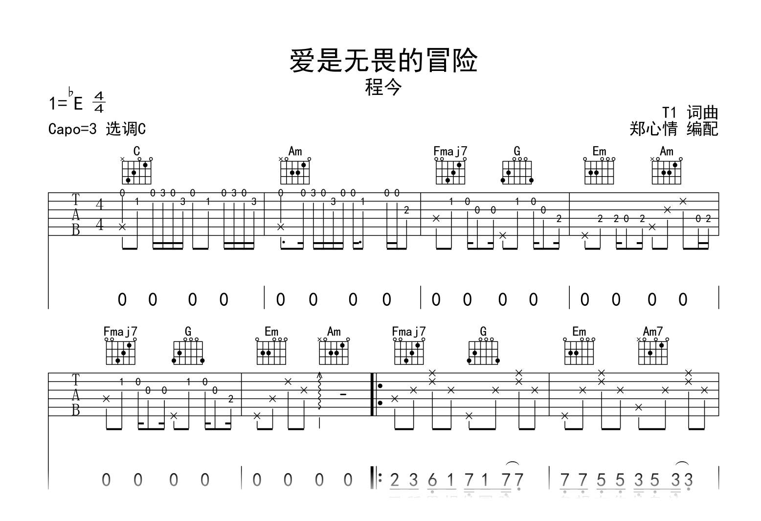 曲谱介绍: 爱是无畏的冒险吉他谱,程今演唱,《爱是无畏的冒险》吉他弹唱谱,原调bE调,选用C调指法编配,变调夹夹3品,也可以根据个人音域调整变调夹的位置。