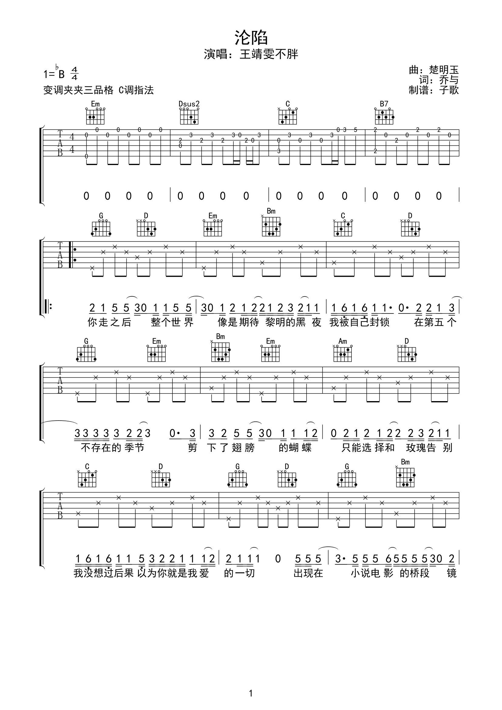 沦陷吉他谱 - 王靖雯不胖 - C调吉他弹唱谱