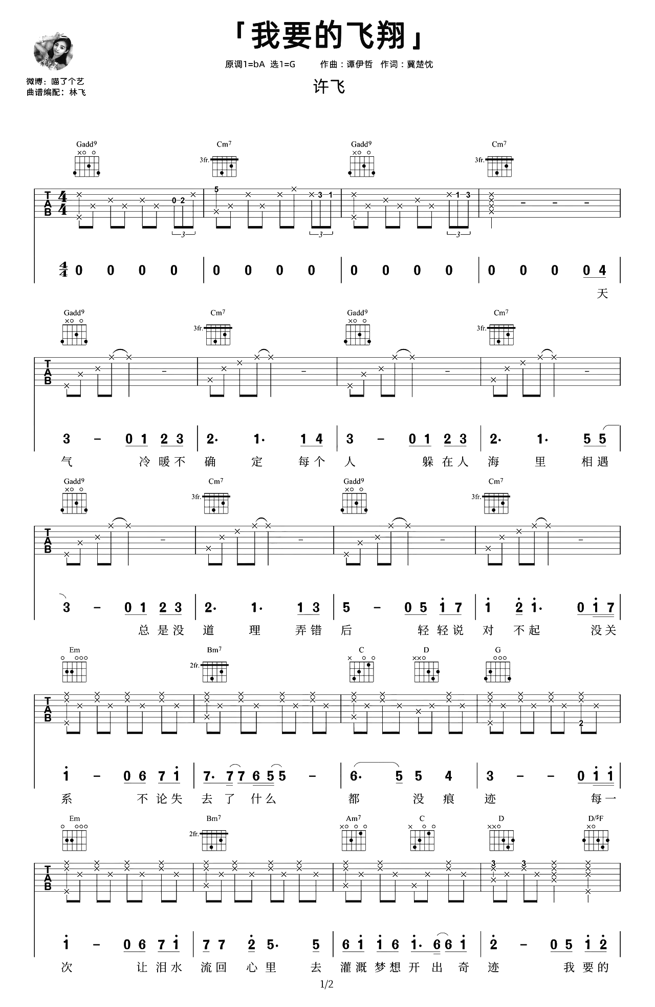 曲谱介绍: 我要的飞翔吉他谱分享,许飞演唱的歌曲,《我要的飞翔》吉他弹唱谱,选用G调指法,原调bA,CAPO夹1品弹回原调弹唱,随谱附弹唱演示视频,下方另提供了PDF的曲谱下载。