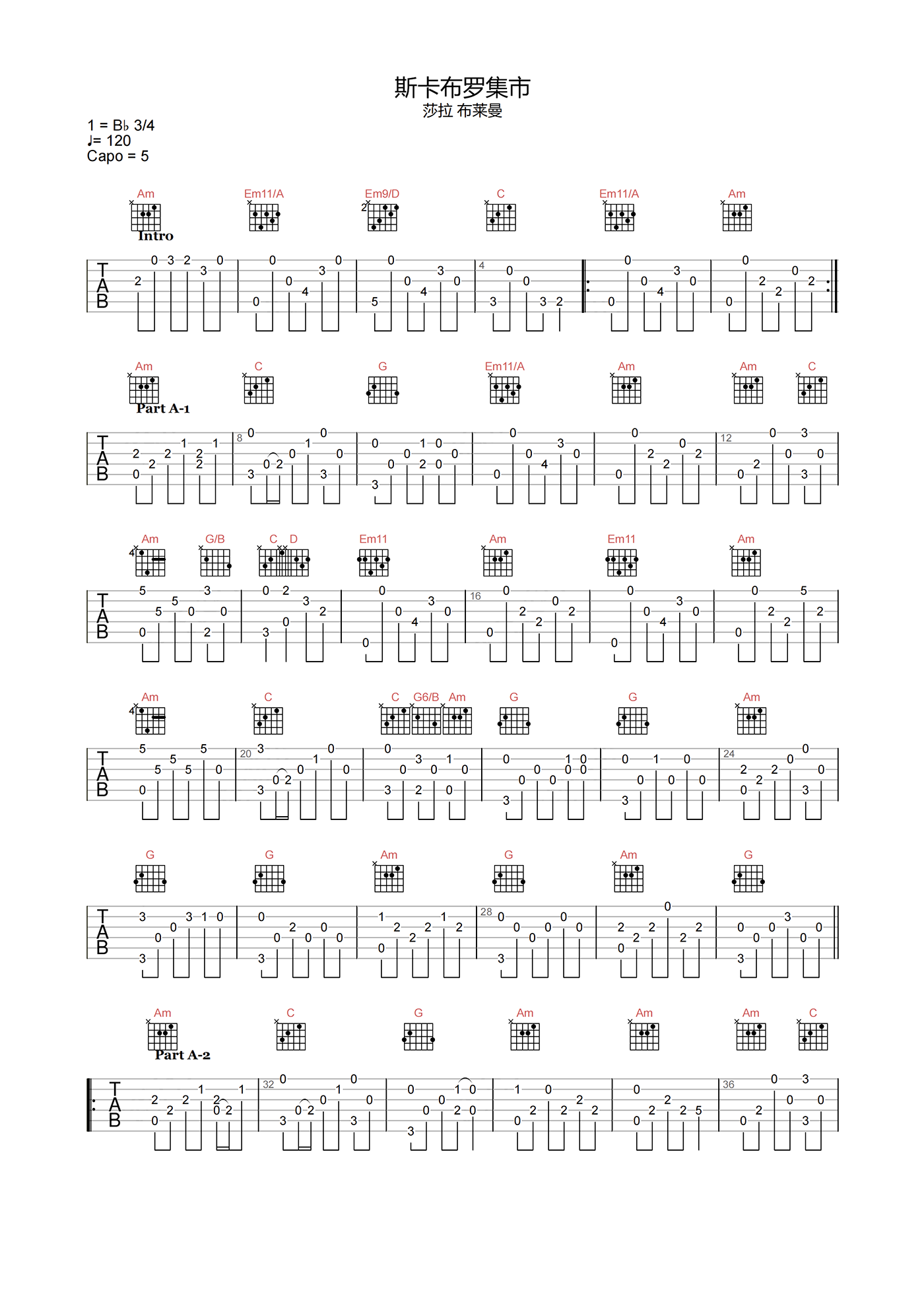 曲谱介绍: 斯卡布罗集市指弹吉他谱,莎拉布莱曼演唱所改编,弹奏CAPO夹5品处,速度控制在120拍每分钟,节奏3/4拍,指弹难度3级较简单,多加练习可快速上手哦! 《斯卡布罗集市》也许真的算是经典神作,百年难得一出,此曲心静舒坦,仿佛远离红尘俗世的纷扰,回到了满怀希翼的初心,它能够穿过时间隧道,抚慰每一代人柔软的心。