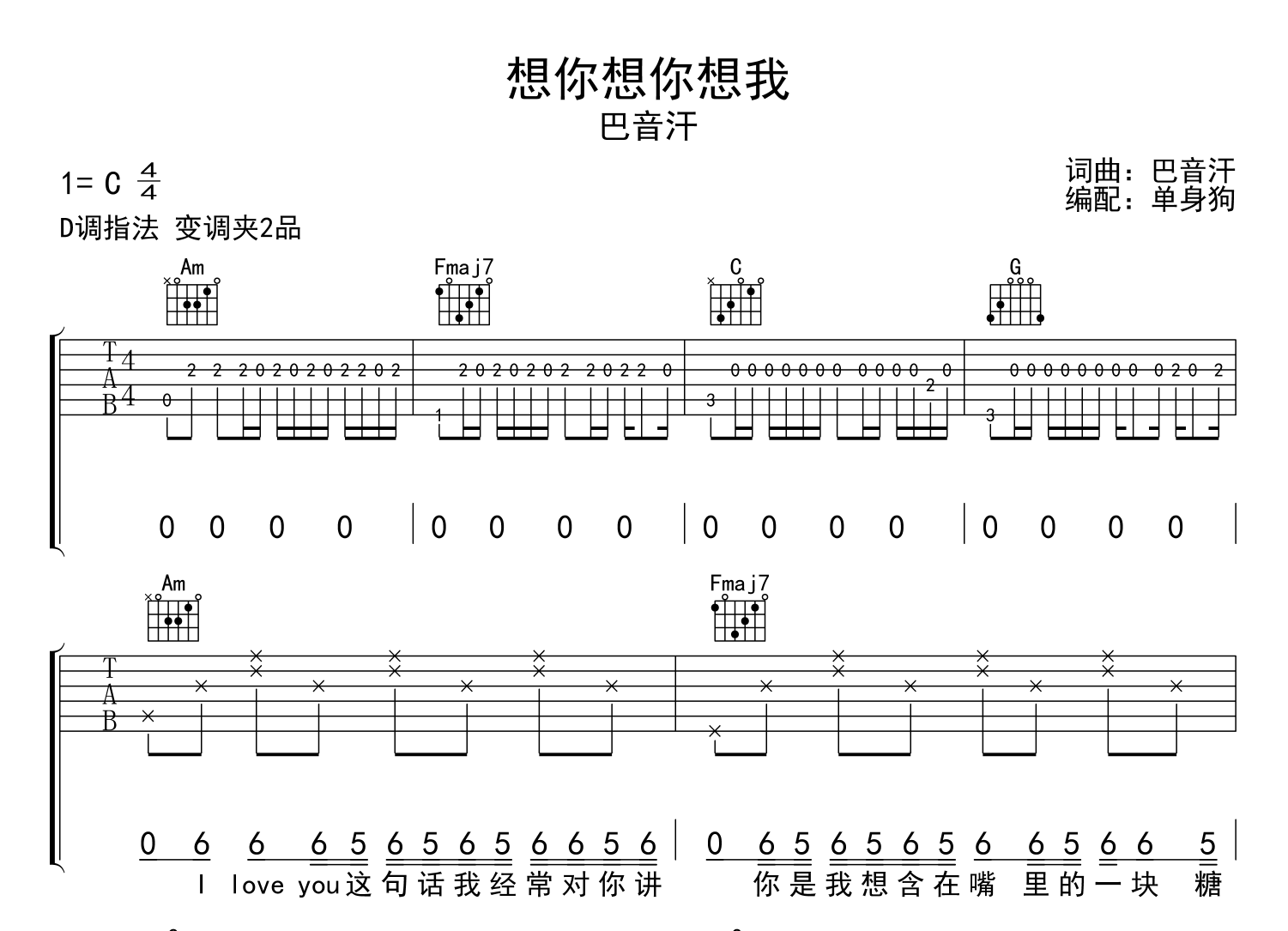想你想你想我吉他谱 - 巴音汗 - 吉他弹唱谱