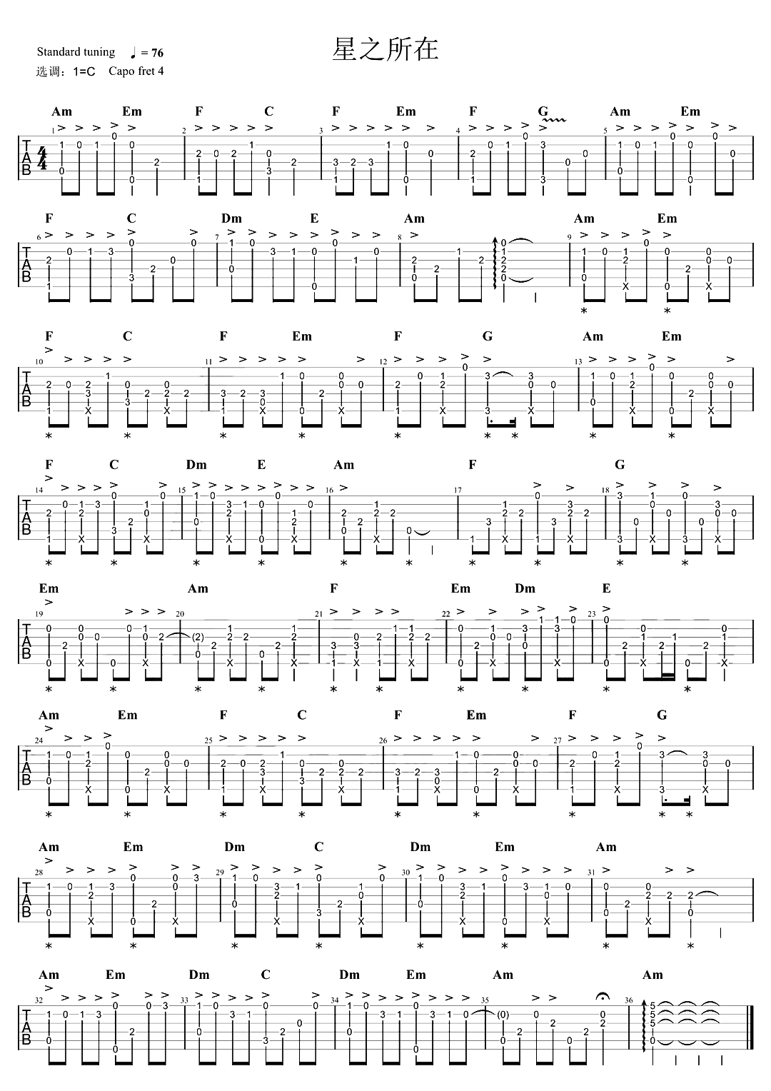曲谱介绍: 星之所在指弹吉他谱,《英雄传说6:空之轨迹》的主题曲,谱子的指法不太难,如果你会常用的“底鼓打板”和“拍弦+刷弦”技巧的话,应该看着谱子基本都可以搞定,速度76拍每分钟,CAPO夹4品弹奏,可以参考下面小七老师的弹奏示范。 《星之所在》歌名可能你不太熟悉,但是旋律声响起,你一定会说很耳熟,可能无意中在某些场景听到过吧,原版是一首日文歌曲,它的口琴版本知名度也很高,旋律好听又感人。 指弹谱详情