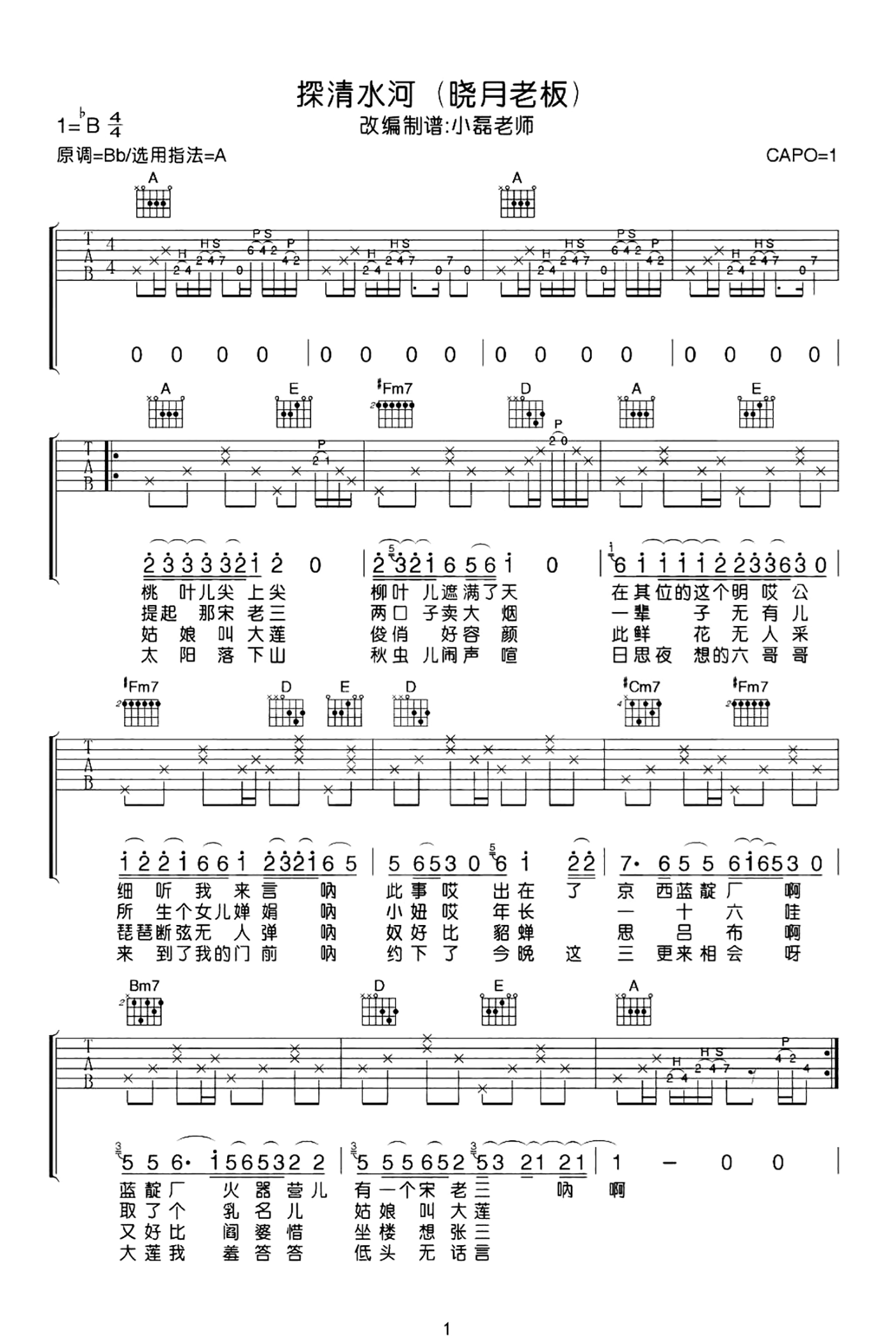 曲谱介绍: 探清水河吉他谱分享,晓月老板演唱的歌曲,《探清水河》吉他弹唱谱,选用A调指法,原调bB,弹唱需要降半音调弦,随谱附弹唱演示教学视频,供琴友们参考。本曲谱由琴谱网整理编辑上传。 曲风保留着北京小调的韵味,背后讲的是类似“梁祝”的凄美爱情故事,老曲的重新演绎总是会给我们不一样的惊喜,当戏曲唱腔和流行音乐完美结合,在穿越百余年之后,重新赋予更丰富的情感表达!