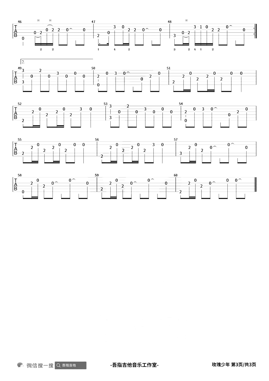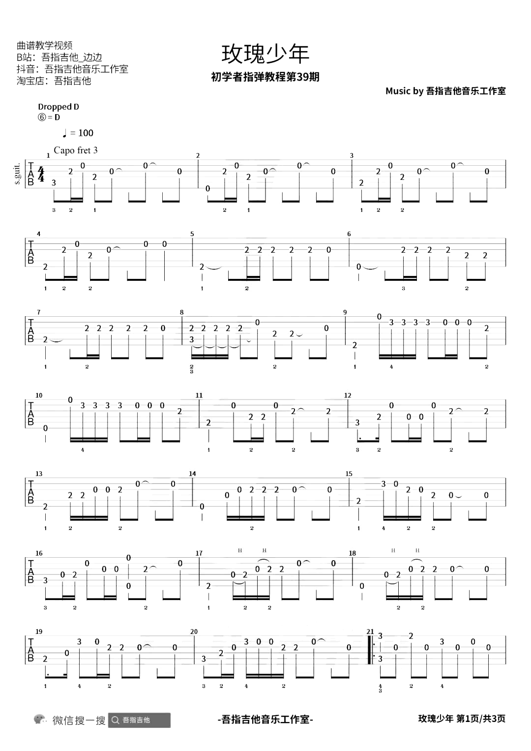 曲谱介绍: 吉他谱介绍:玫瑰少年指弹吉他谱,五月天的一首指弹吉他曲目,这首曲子采用的是特殊调弦,4/4拍的节奏,练习之前6根琴弦需要调到对应的音,曲谱上有标注,注意调音过程中不要断弦。小技巧:琴弦振动过程中不要调音,用手制音之后再旋转弦钮,会大大降低断弦的几率。演奏时建议夹变调夹3品,也可根据个人实际情况选择。曲谱由琴谱网更新上传,共3张高清图片指弹吉他谱例,来源于@吾指吉他编配出品。非常好听的一首歌《玫瑰少年》,这里是改编而来的指弹吉他版本,采用Dropped D的特殊调弦编配。 玫瑰少年指弹吉他教学